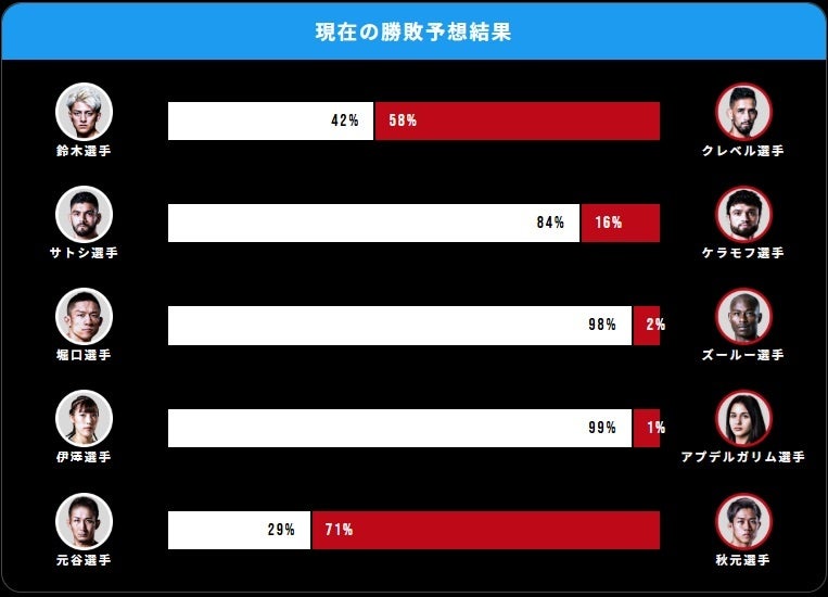 ほかにも、バンタム級王座次期挑戦者決定戦の元谷友貴選手が29%に対し、秋元強真選手は71%で優勢、伊澤星花選手の試合では、伊澤選手が99%の優勢に対し、ルシア・アプデルガリム選手が1%という圧倒的な結果となりました。本キャンペーンの応募締め切りは12月31日(火)19時までです。ぜひ、大会に併せてお楽しみください。