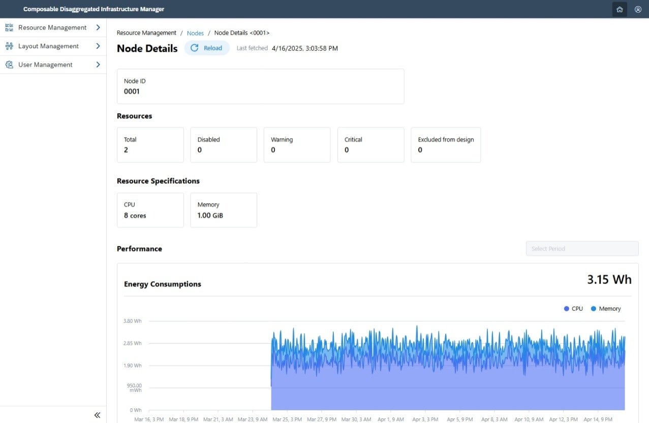 個々のコンピュートノードを構成するリソース数、コンピュートノードごとの消費電力の推移、異常の有無などを確認可能