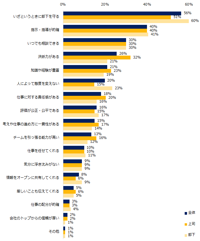 「上司に必要な資質は何だと思いますか?」と伺うと、トップ3は「いざというときに部下を守る」(56%)、「指示・指導が的確」(40%)、「いつでも相談できる」(30%)でした。