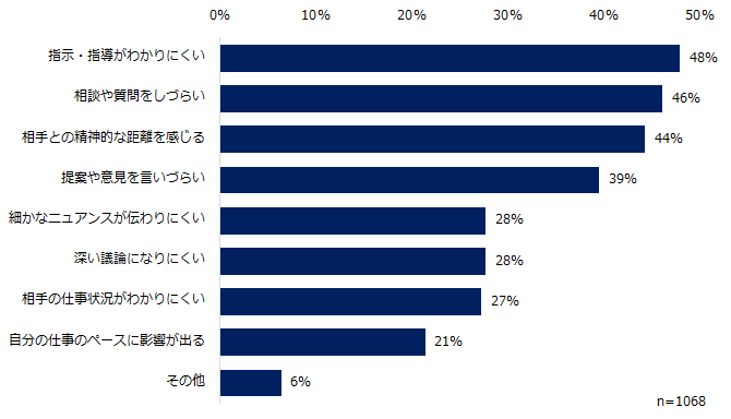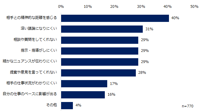・上司がほとんど職場におらず、チャットツールも退席中のためリアルタイムでのやりとりができない。(30代女性)
