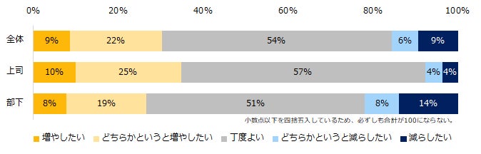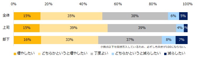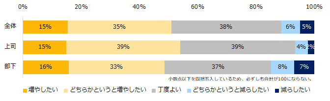 「現在の上司または部下との“業務内容”についてのコミュニケーション頻度についてどう感じますか?」と伺うと、50%が「増やしたい」(増やしたい:15%、どちらかというと増やしたい:35%)と回答しました。