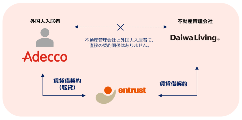 この業務提携契約を通じた事業の展開にあたっては、はじめにイントラストが特定技能外国人入居者に代わり、大和リビングと賃貸借契約を締結して賃借人になります。そのうえで、イントラストは、Adeccoがサポートする特定技能外国人入居者と賃貸借契約を締結し、転貸します。これにより、Adeccoに登録した外国人財は、日本で生活基盤を築くための重要な要素のひとつである住居の確保をスムーズに行うことができ、賃貸人である大和リビングは、滞納やコミュニケーションに起因する契約トラブルの発生といったリスクを避けて、物件を貸すことができるようになります。Adeccoは、特定技能外国人財の生活面の支援も打ち出すことで、登録者の獲得につなげます。
