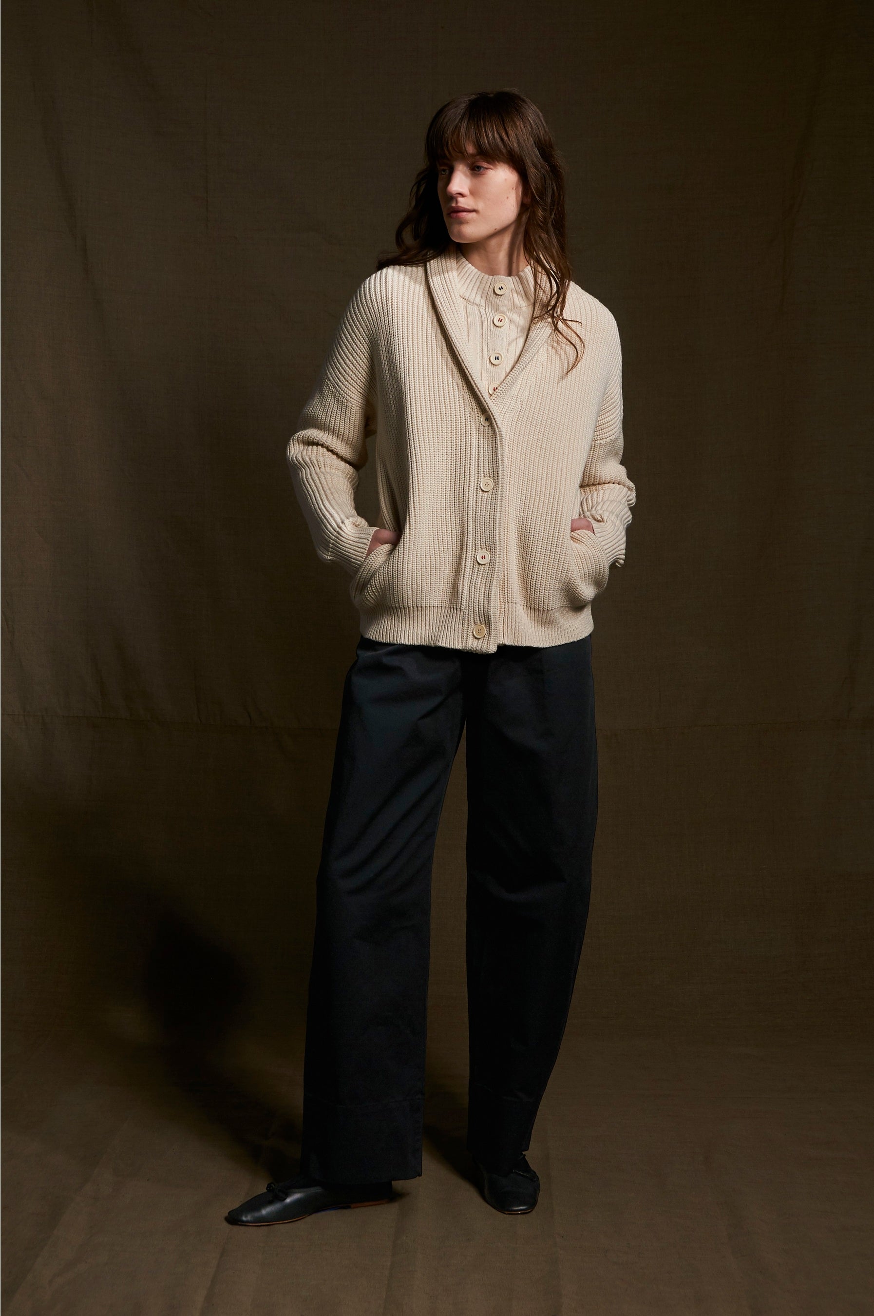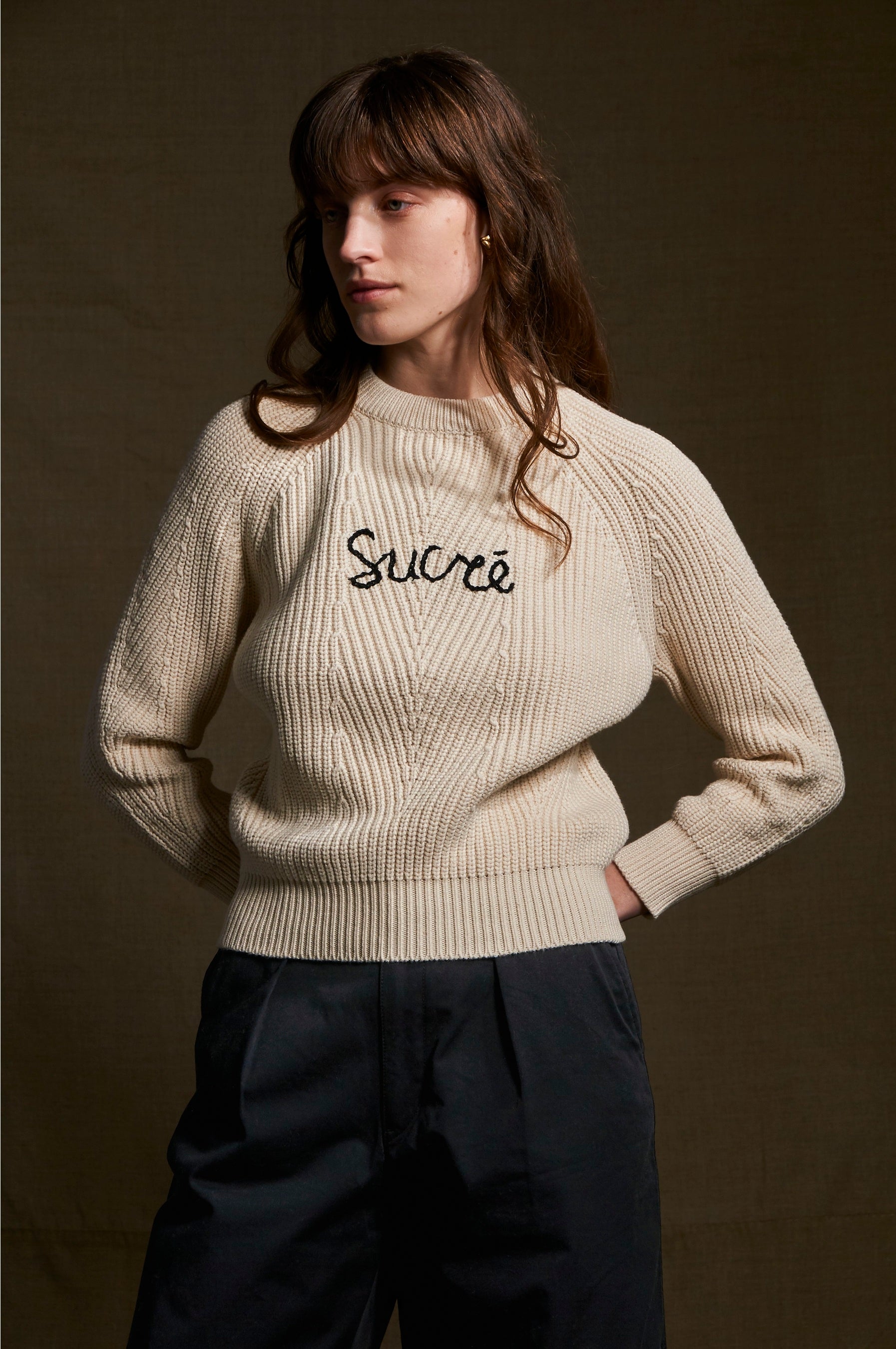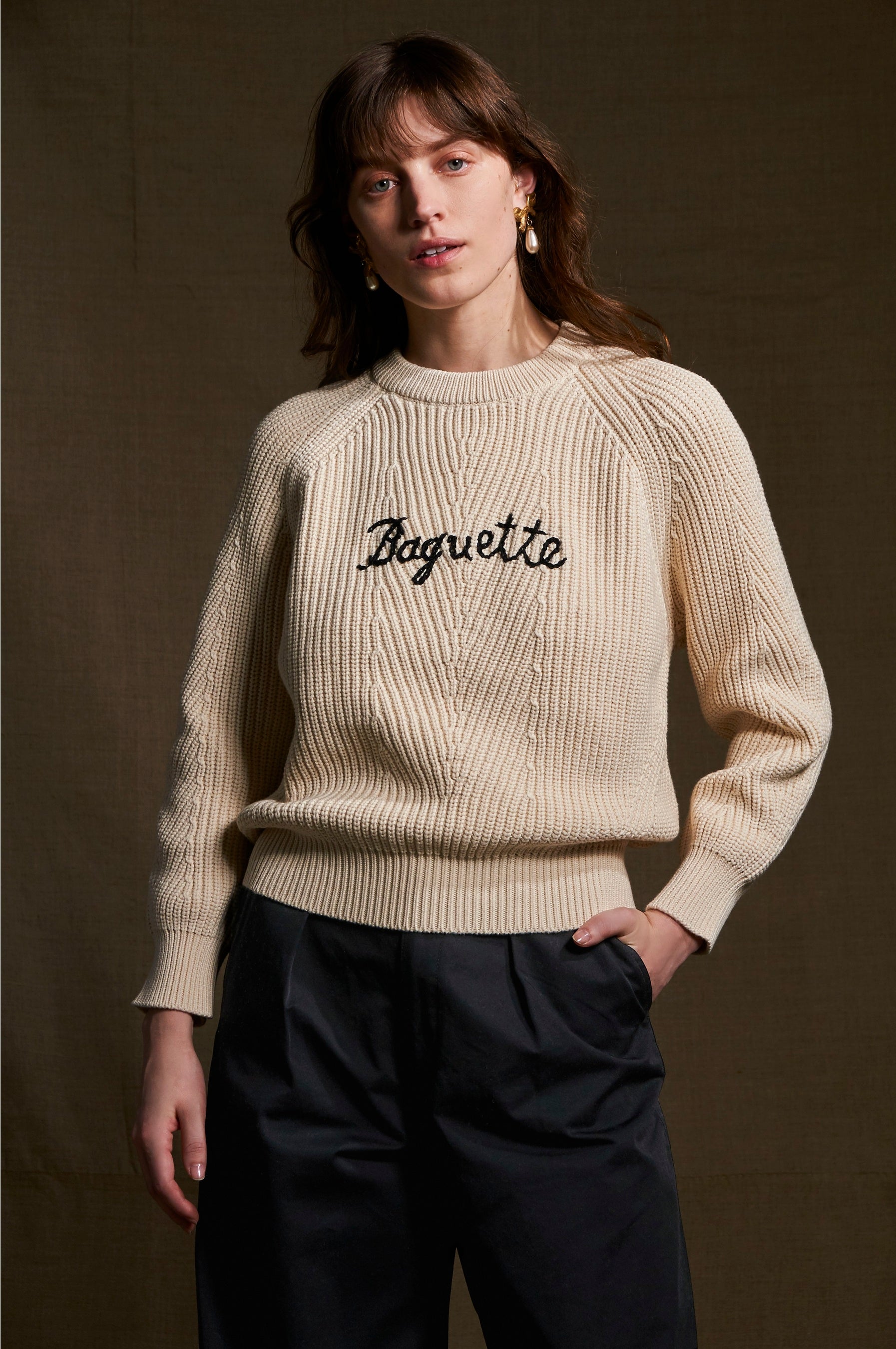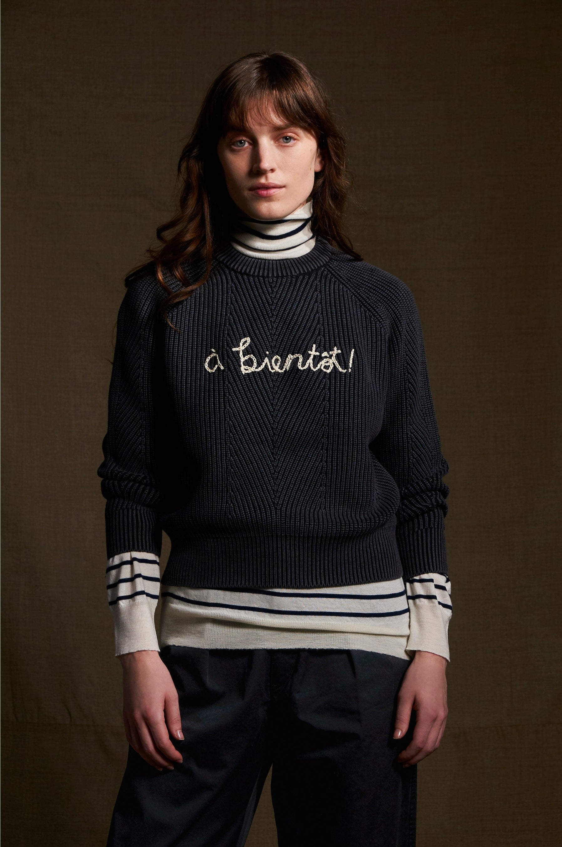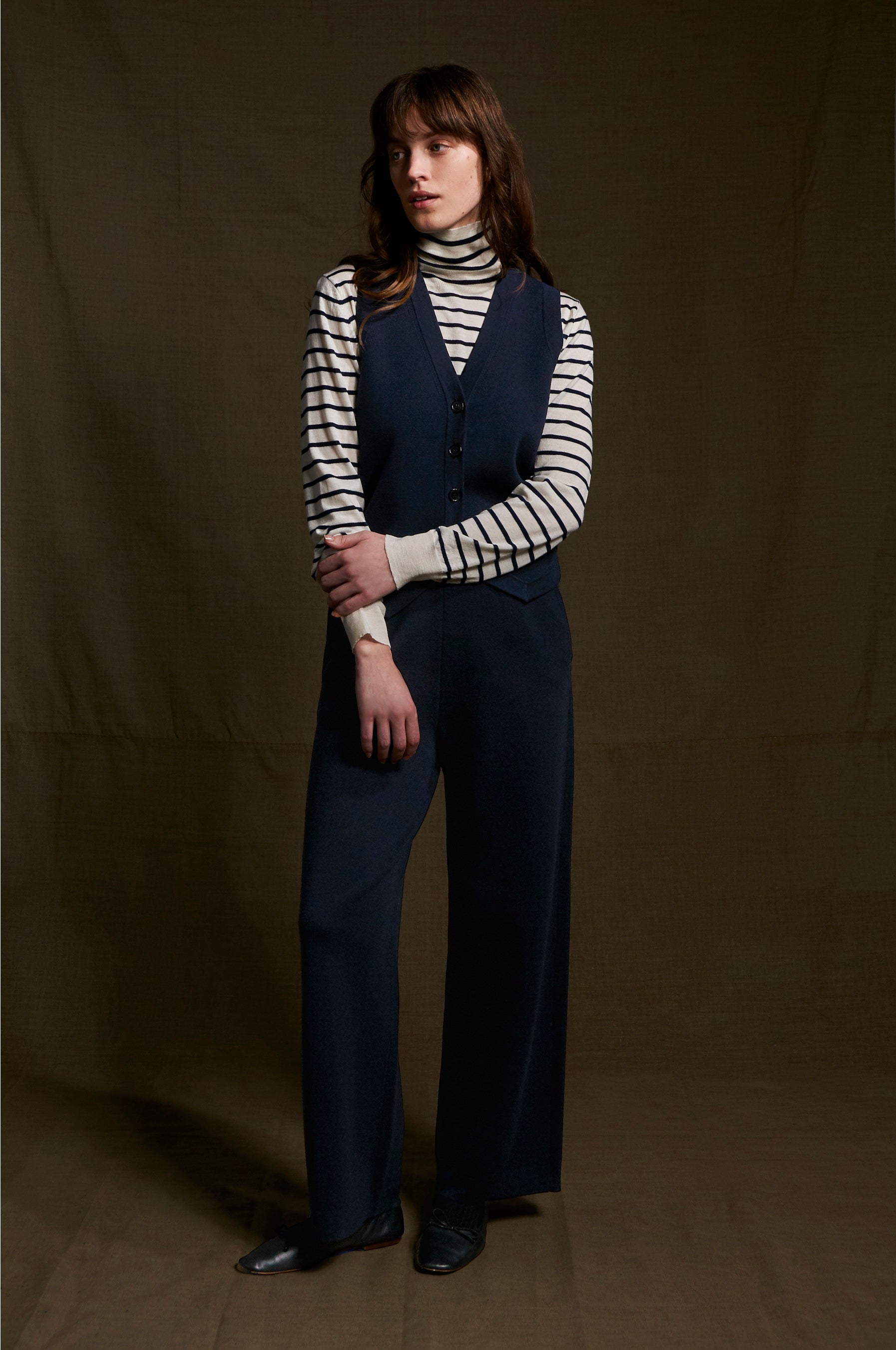 コロナ過が落ち着いたころにデミリーは 、大好きなフランスのマレー地区を訪れました。そこでインスピレーションを得たデミリーは、クラシックなネイビー+ホワイトをベースとした、メリノウールのシティシックなセットアップや、細かい編みのブルトン・ストライプのエフォートレスな新シルエットなど、高級糸を使用したマリンスタイルを作成しました。
