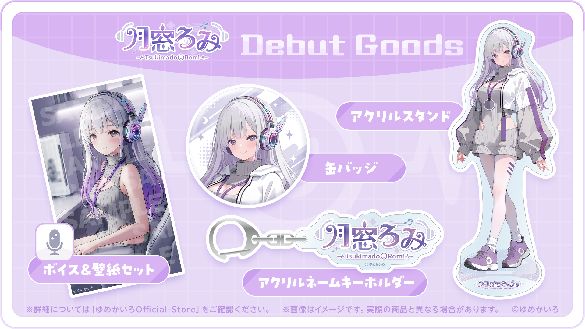 すでに販売を開始している『ゆめみなな』『月窓ろみ』のグッズの他、今後デビューを控えるほかの1期生メンバーのグッズの展示を行います。
