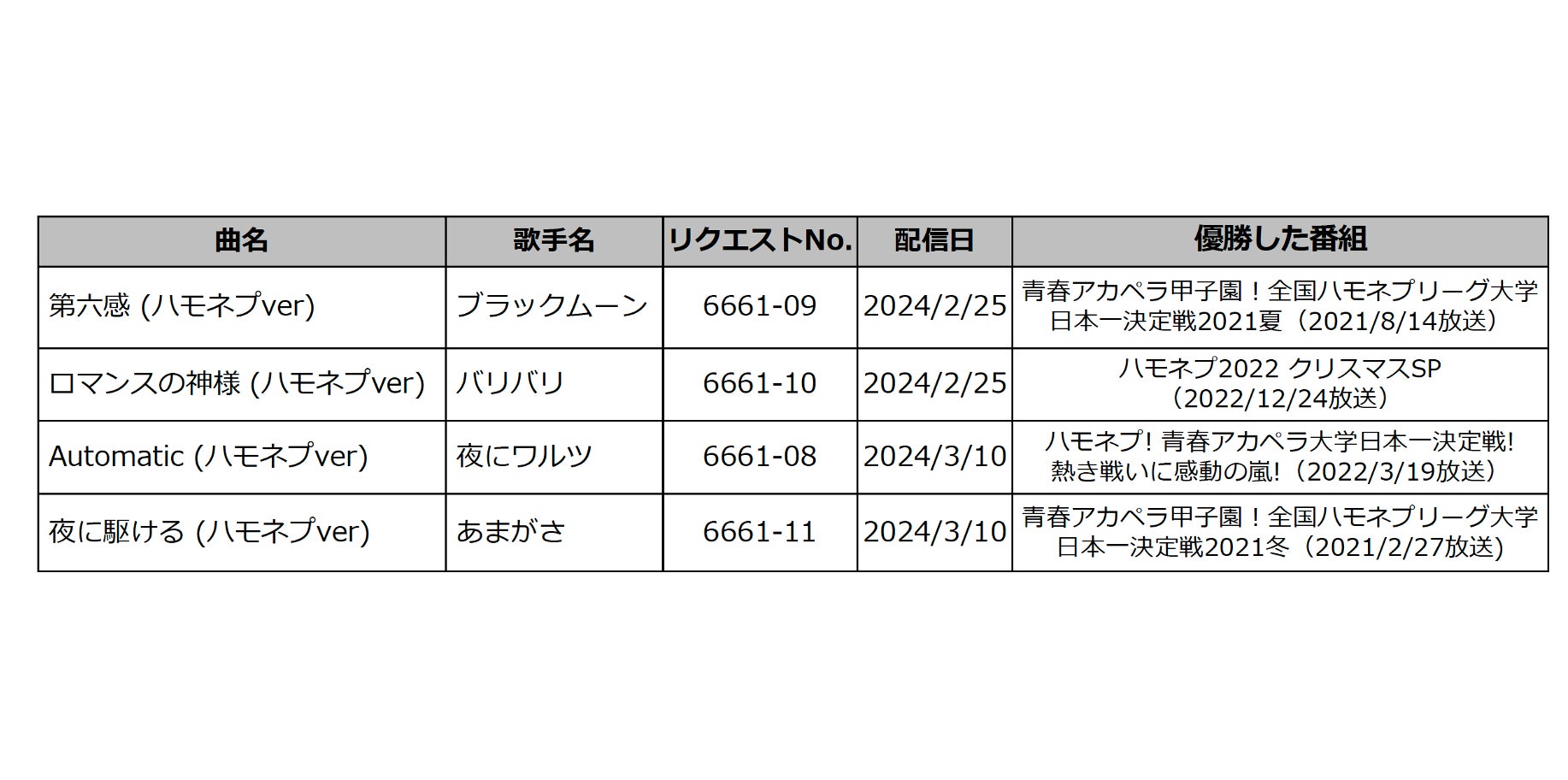 通信カラオケDAMでは、初の生放送を記念して、2021年と2022年に同番組で優勝した4組の“アカペラパフォーマンス映像”4曲を、2月25日と3月10日の2回に分けて独占配信します。