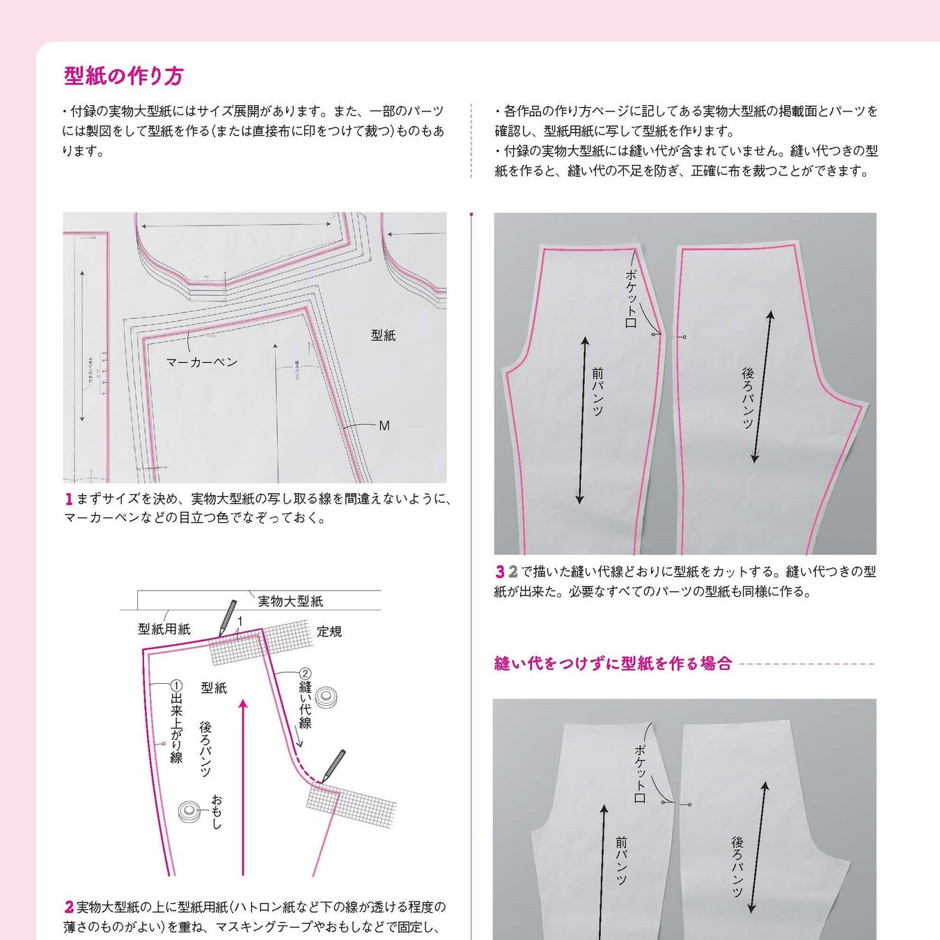 「テクニックガイド」として、型紙の作り方や縫い代のつけ方などソーイングの基本的なことや、パンツならではのすその長さの修正の仕方もすべて写真と図で解説しています。