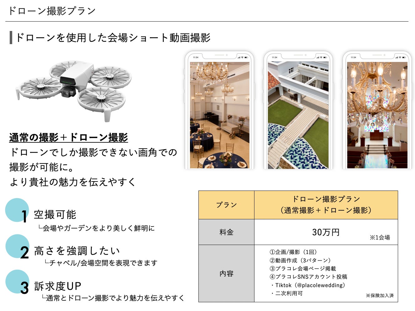 「PLACOLE & DRESSY」ブランドを展開する、冒険社プラコレ(本社:神奈川県鎌倉市、代表取締役CEO:武藤功樹)は、メインサービスである「プラコレウェディング」にて、ドローン撮影を導入・特別プランをスタートしたことをお知らせいたします。