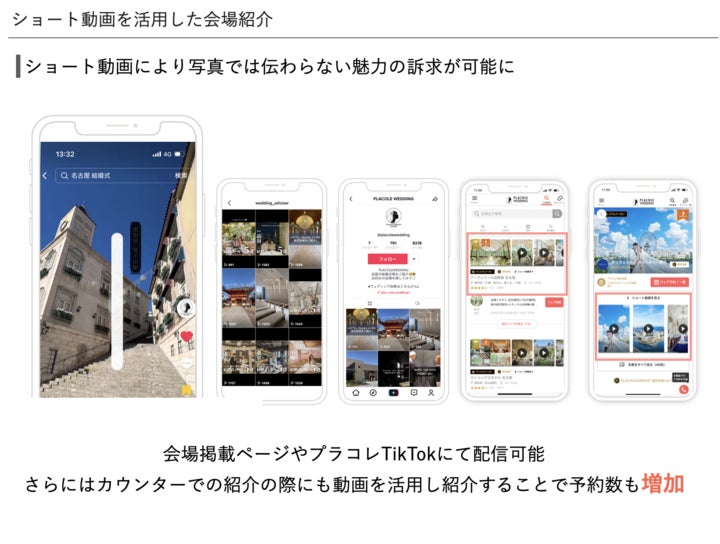 プラコレウェディングでは、会場全体の雰囲気やブライダルフェアで提供されるお料理、紹介されるウェディングプランナーやスタッフからのメッセージ、そして結婚式当日の演出例など、多彩な情報をショート動画でお届けしすることで、静止画では伝えきれない「リアルで臨場感あふれる情報」を花嫁様にお伝えし、式場選びをより魅力的に、かつスムーズに進めていただけるようサポートしています。