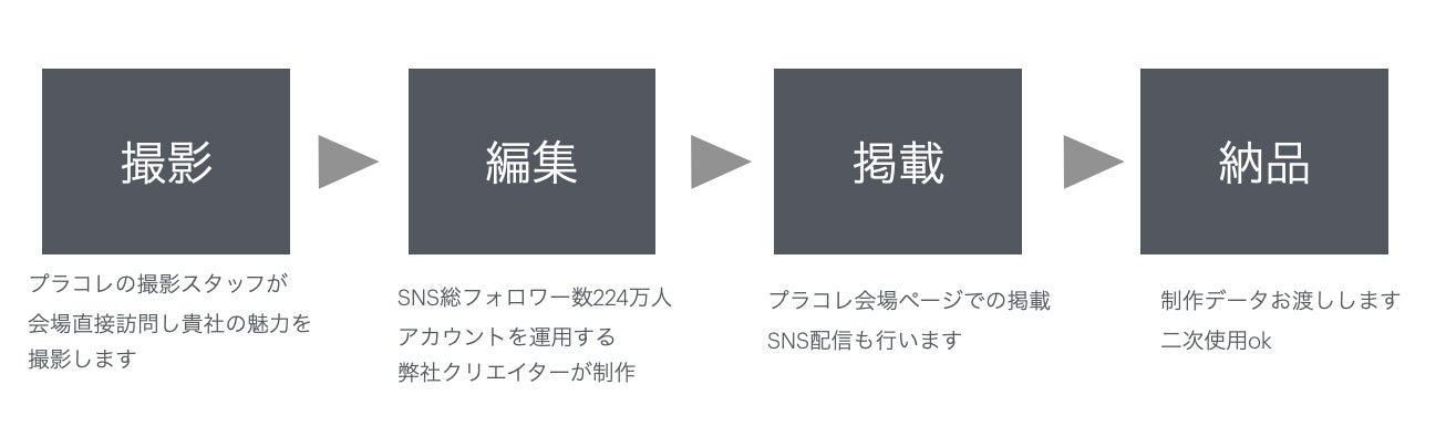 プラコレウェディングと新たにご提携いただく式場様限定の特別プランとして、「通常動画撮影+ドローン撮影」がセットになった30万円のプランをご用意しました。本プランには「撮影・編集・掲載・納品」のすべてが含まれており、式場様はSNSでのショート動画活用を簡単に始められ、効果的な集客につなげることができます。