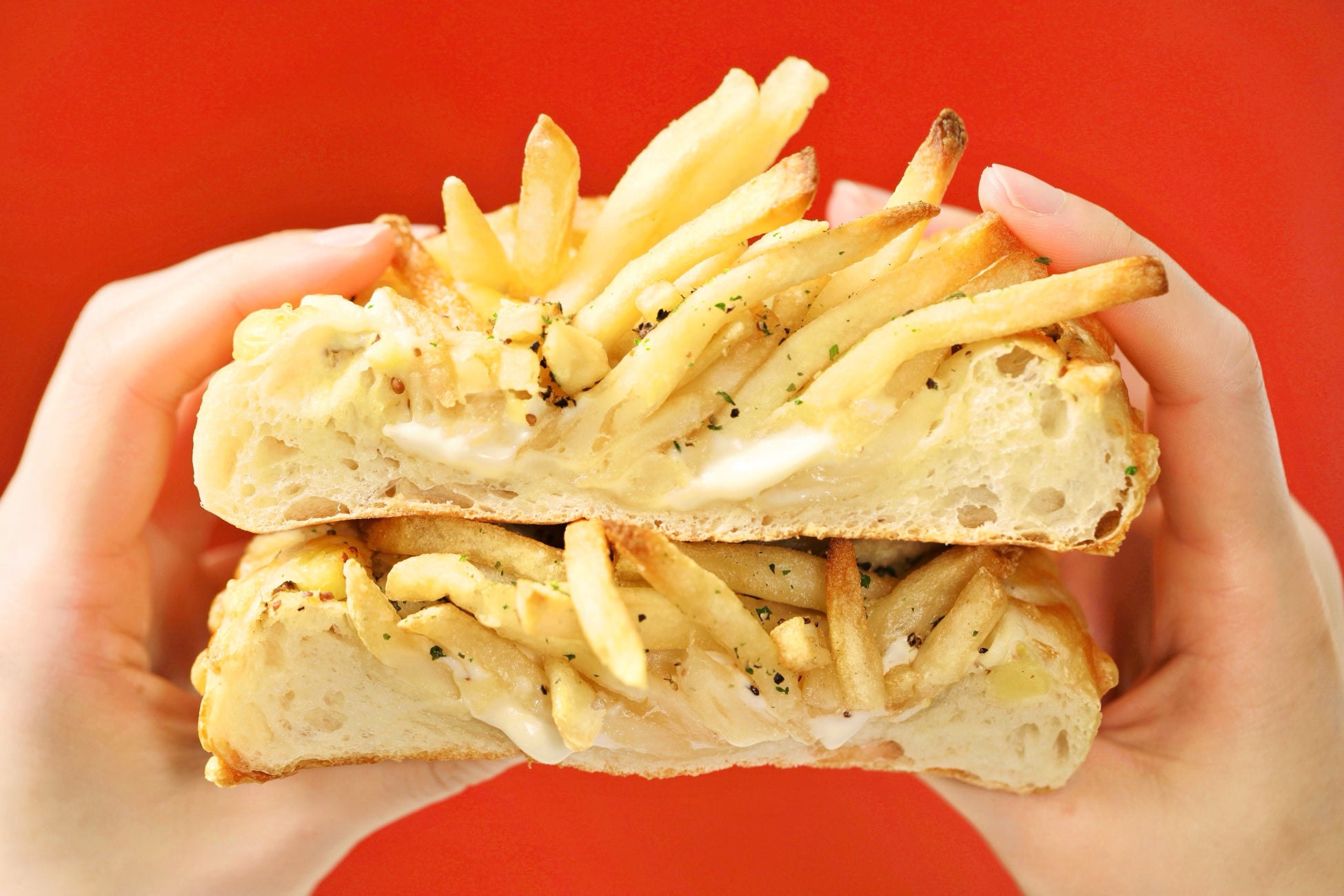 『山盛りポテトチーズフランス』は、累計440万個※1突破の惣菜パン人気No.1の商品『のび~るとろりんチーズフランス』を使用し、カリッとした食感のフライドポテトを“山盛り”にのせたジャンク感満載の新商品です。