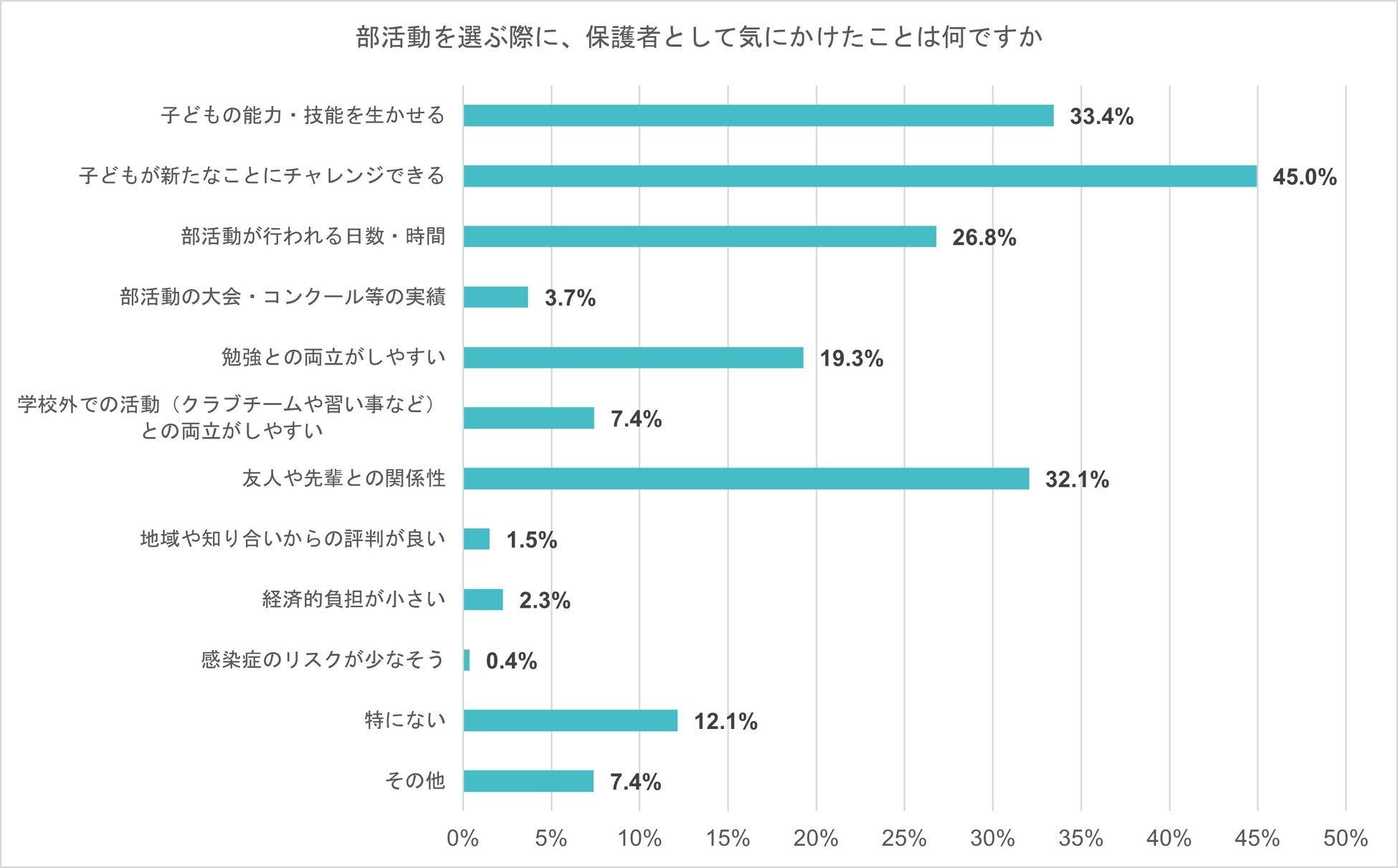 - 部活動を選ぶ際に保護者として気にかけたこと 「新たなことにチャレンジできる」が45%で最多