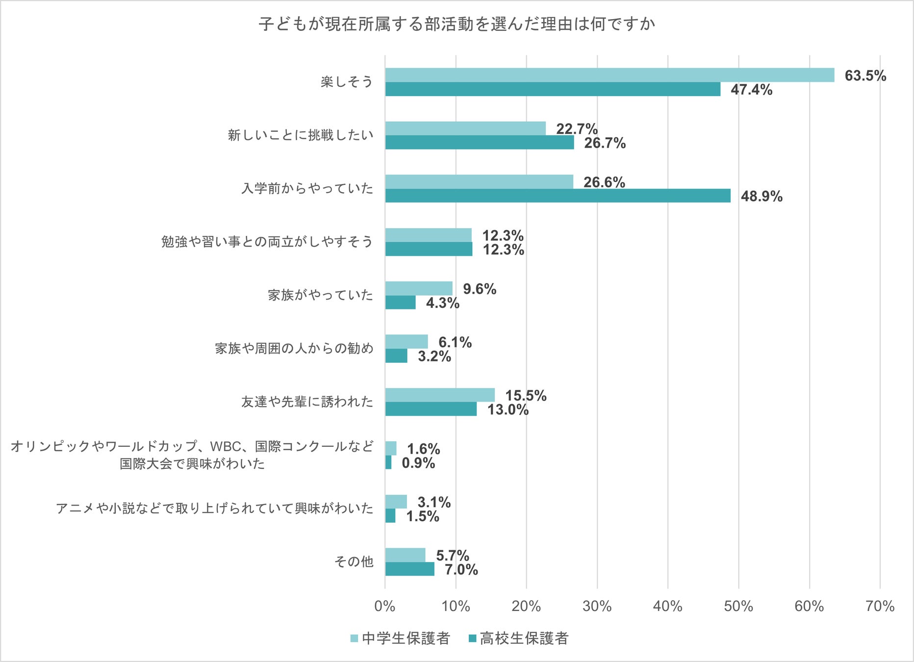 中学生保護者は「楽しそう」、高校生保護者は「入学前からやっていた」が多いことが分かった。高校生は高校入学後も、中学校で所属していた部活動を選ぶことが多いためと考えられる。