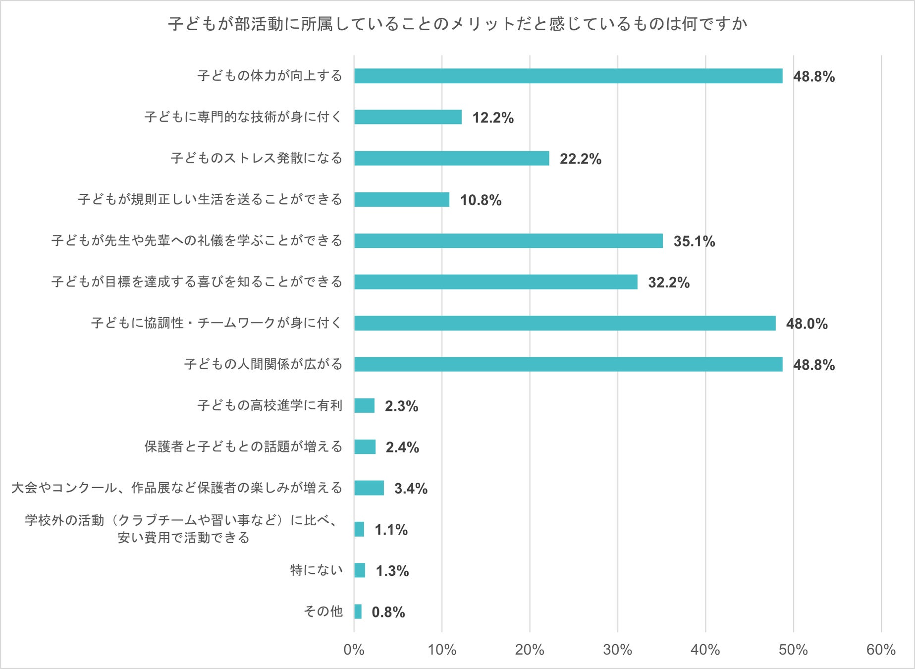 「子どもの体力が向上する」「子どもの人間関係が広がる」が最も多く48.8%、次いで「子どもに協調性・チームワークが身に付く」が48.0%、「子どもが先生や先輩への礼儀を学ぶことができる」35.1%だった。