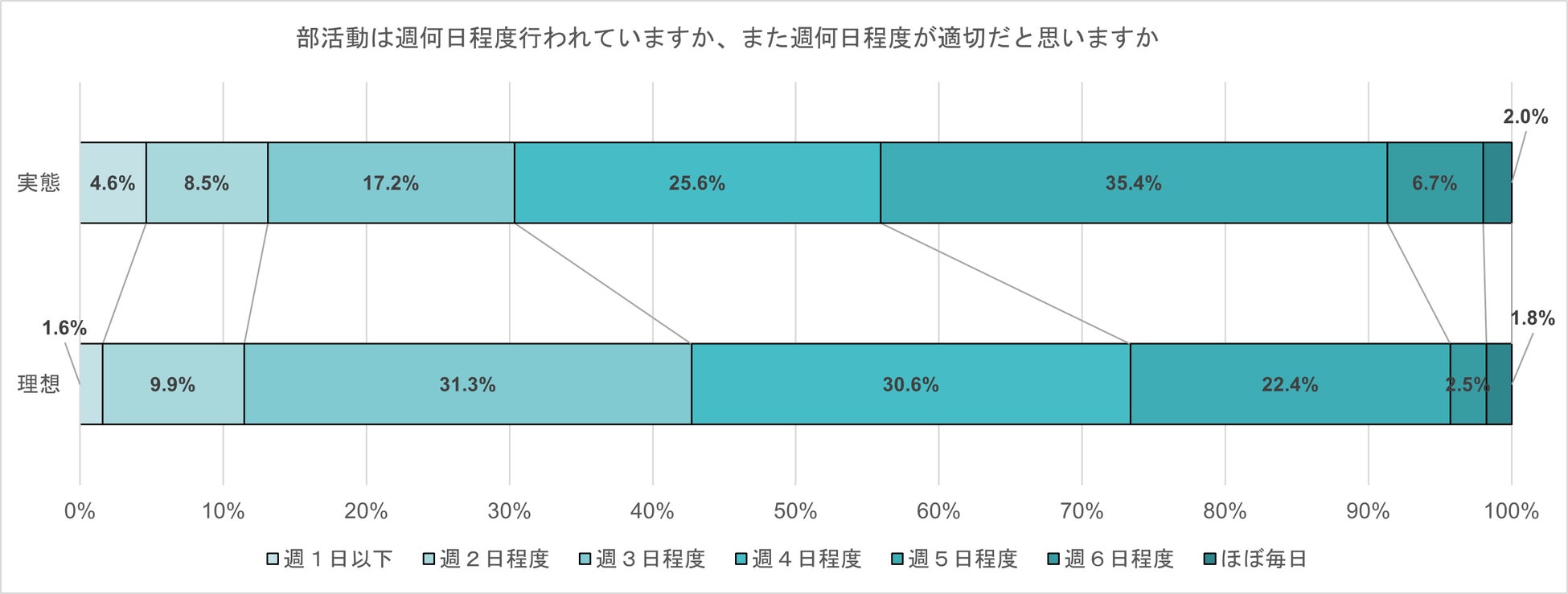 現在の部活動の活動日数と、適切だと思う活動日数を聞いた。