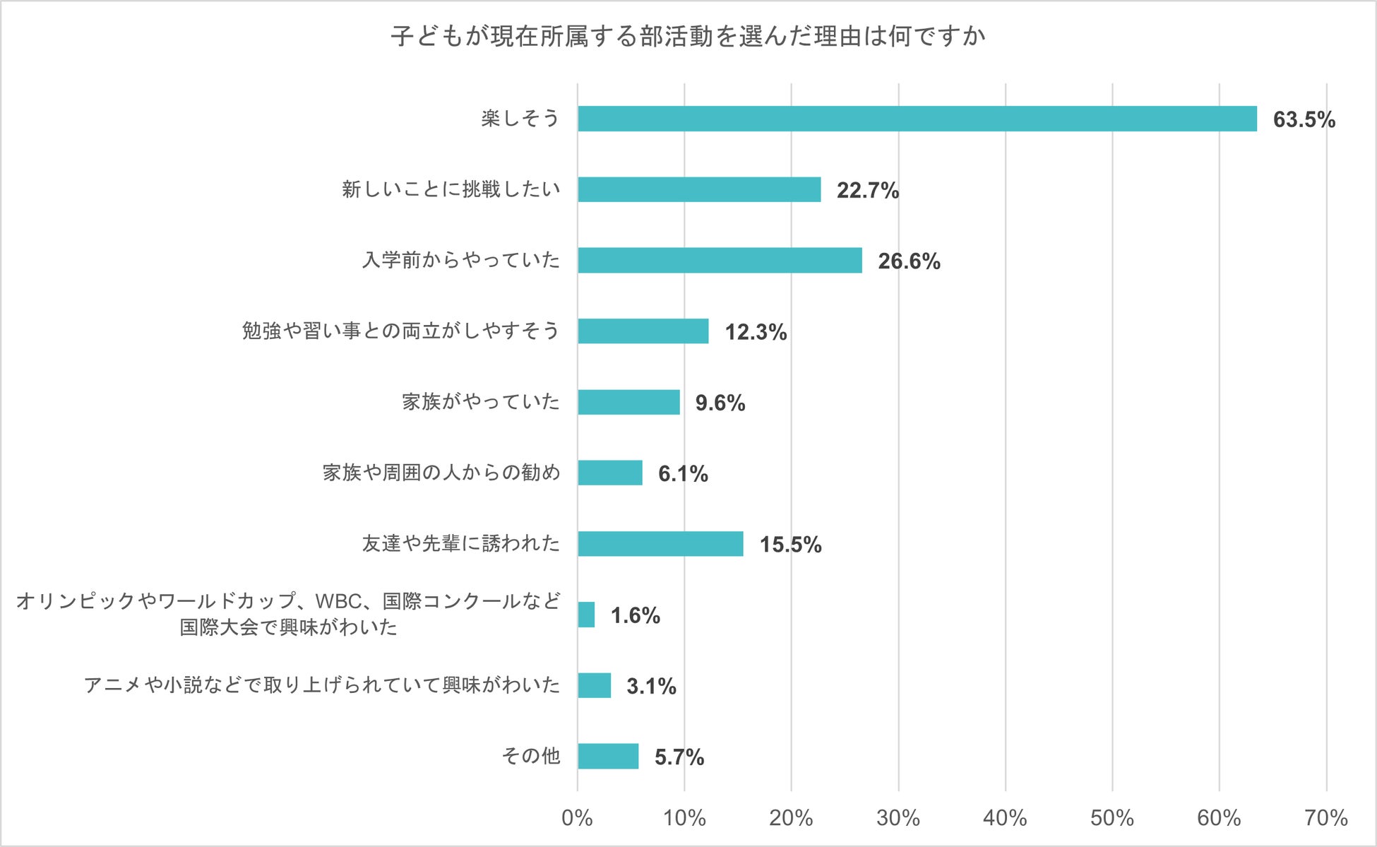 次に、子どもが部活動に所属していると回答した保護者に、子どもがその部活動を選んだ理由を聞いたところ、最も多かったのは「楽しそう」で63.5%、次いで「入学前からやっていた」26.6%、「新しいことに挑戦したい」22.7%だった。