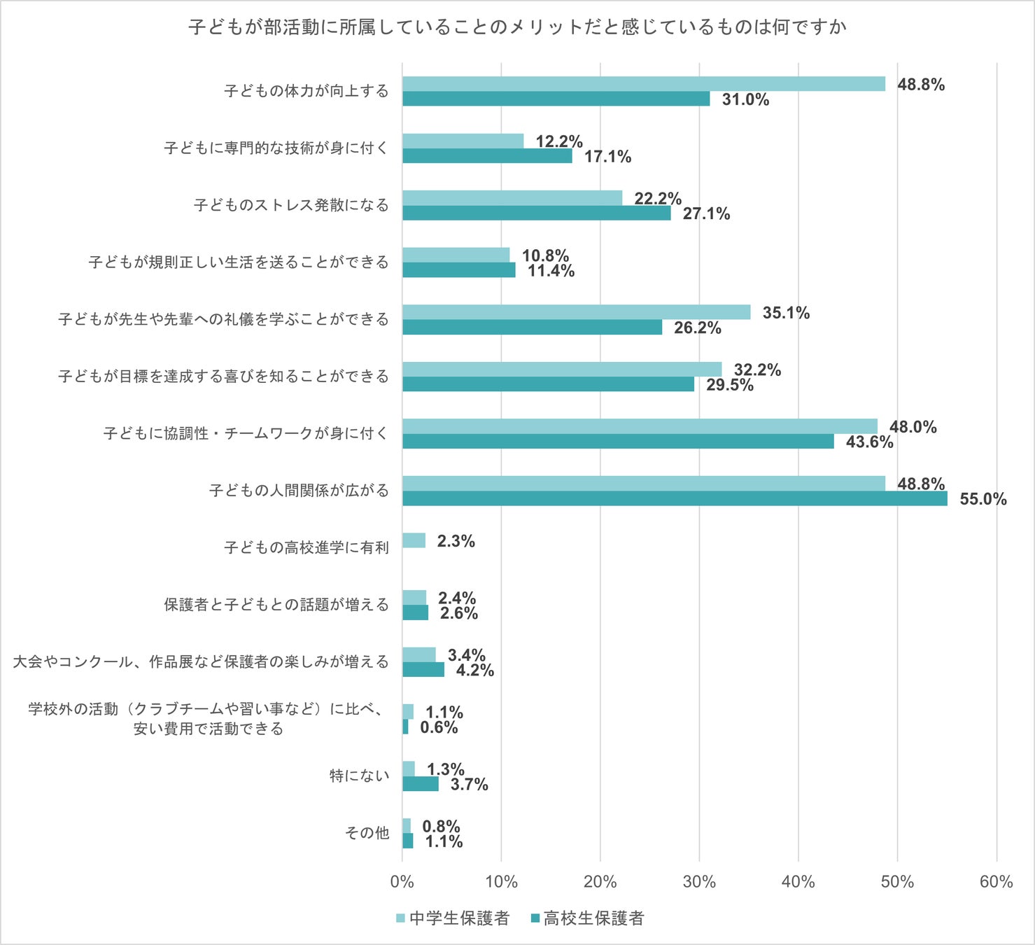 体力面での利点を感じているだけでなく、部活動が子どもの内面的な成長にもつながっていると感じている保護者が多いようだ。