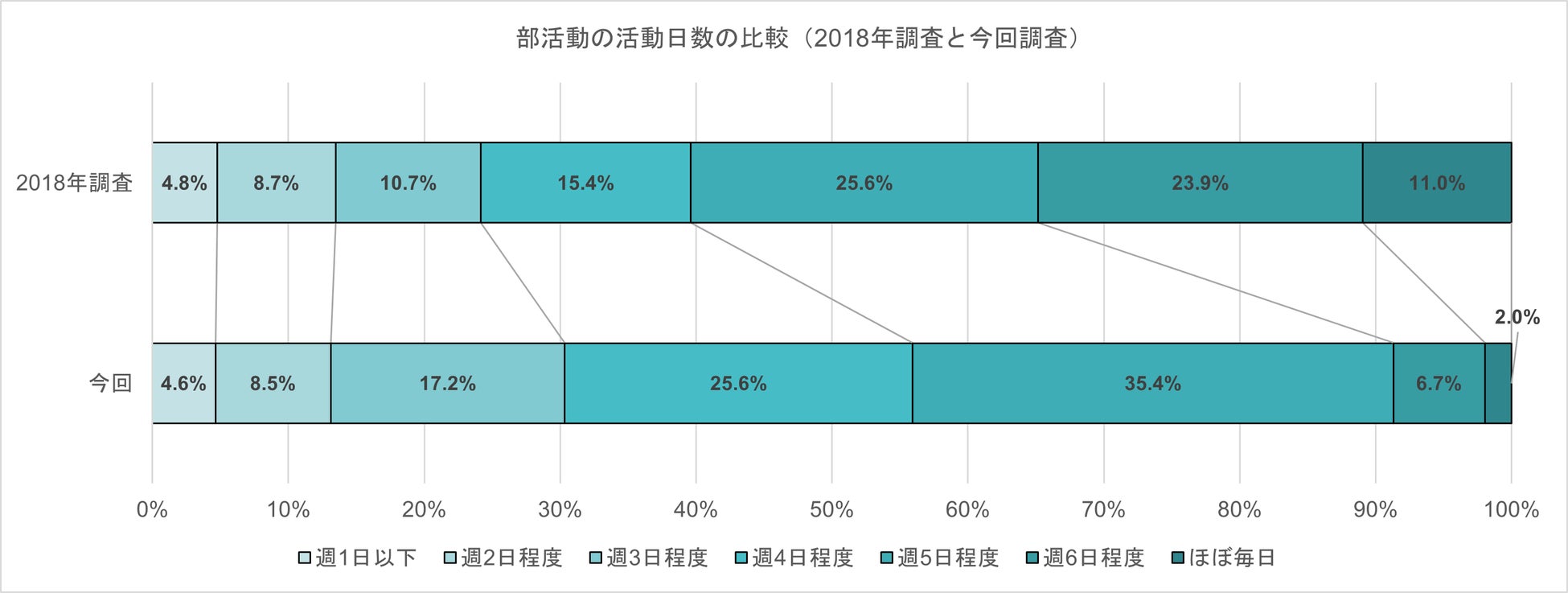 - 部活動の日数は減少傾向 週6日以上が激減し、週4・5日が全体の6割に ※2018年同調査と比較