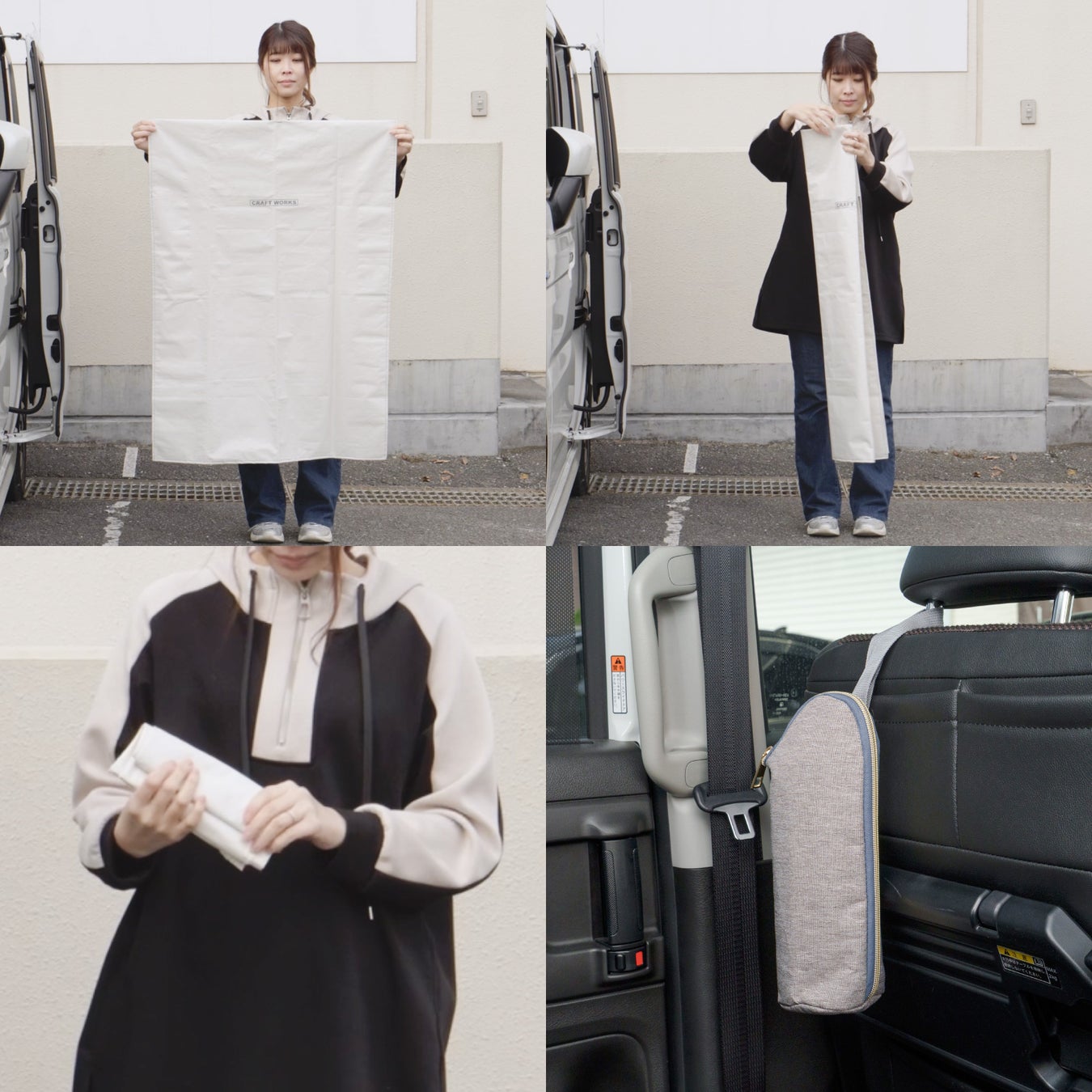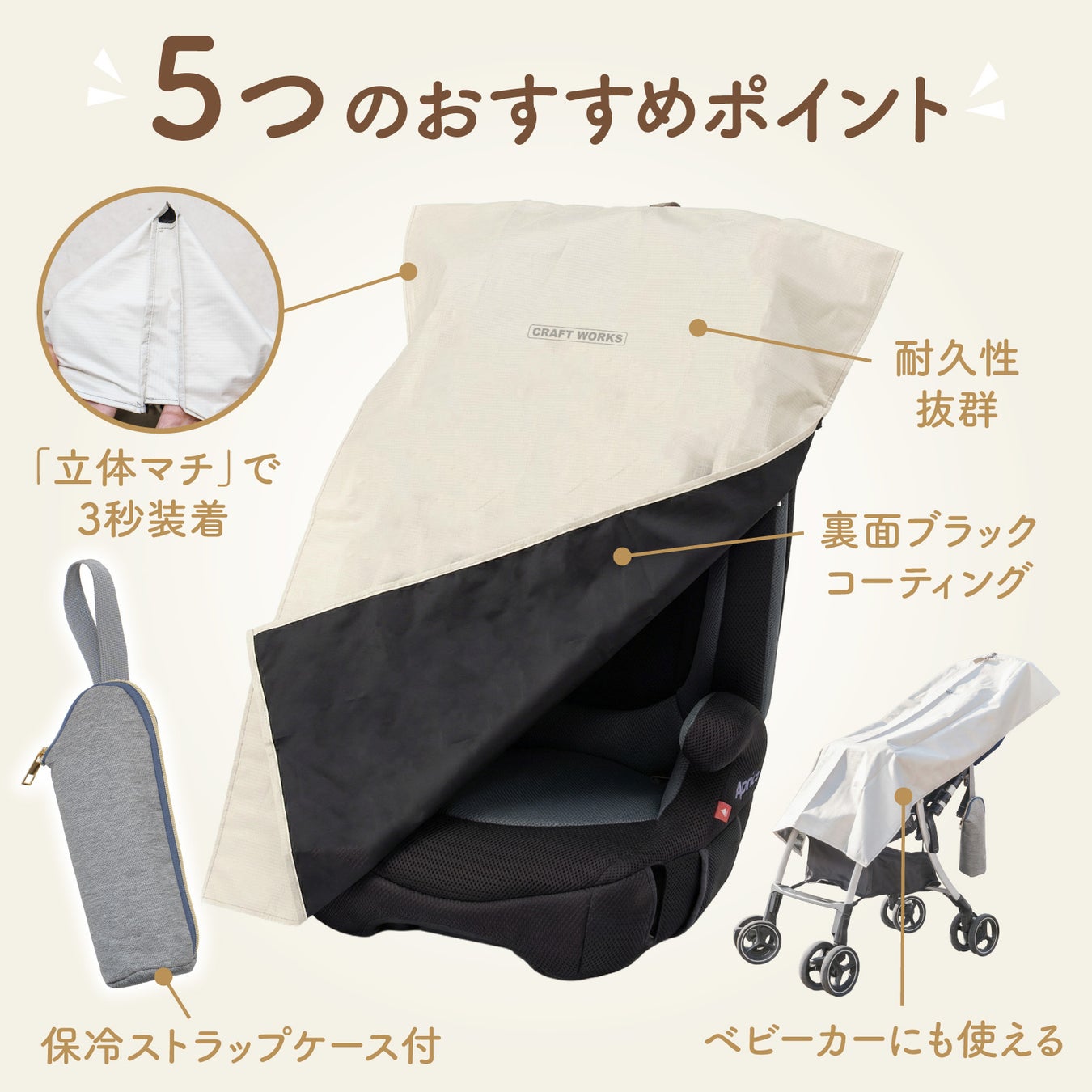 立体マチ構造で簡単に取り付けでき、熱を遮るブラックコーティングを採用。炎天下でも熱がこもりにくく、すぐに乗せられる状態を実現。片手でも扱える設計で日常使いにも配慮、ベビーカーにも使える1台2役仕様。