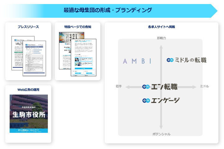 プレスリリースや特設ページ、Web広告での告知に加え、各求人サイトでの集客支援を実施。『エン転職』『エンゲージ』『AMBI』『ミドルの転職』とターゲットの異なる求人サイトを活用することで、ターゲットへ網羅的に求人を届けます。