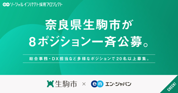 奈良県生駒市、エン・ジャパンで総合事務・DX担当など8ポジションの公募開始。