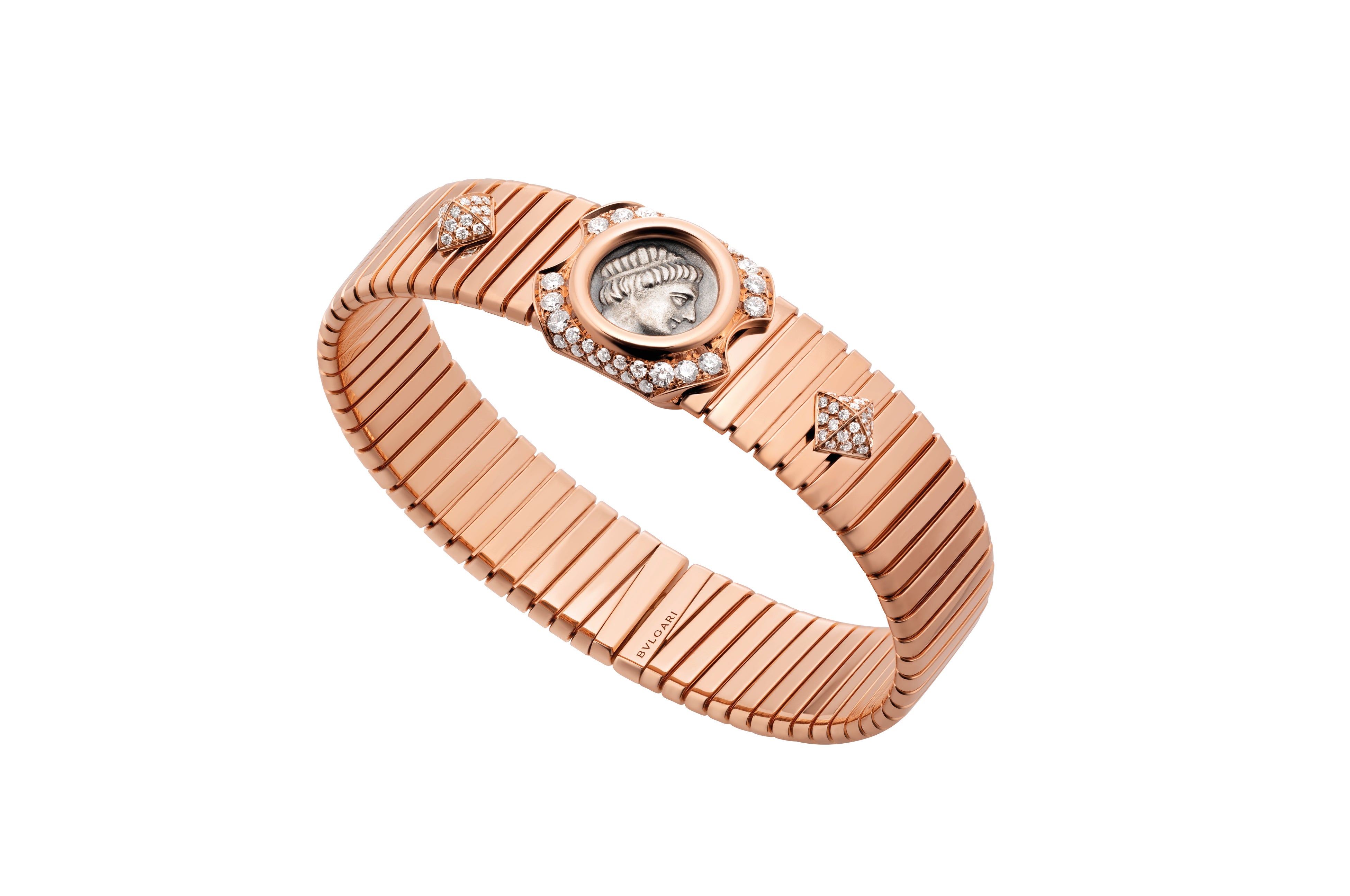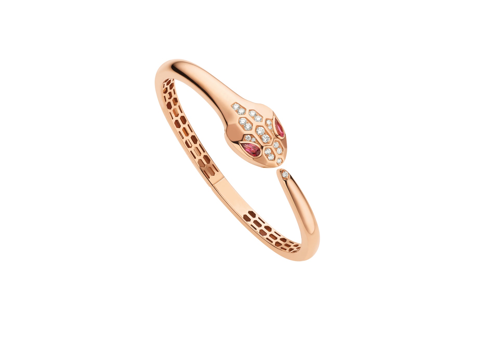 古代ギリシア・ローマ時代より「英知」や「永遠」のシンボルとして人々を魅了してきたセルペンティを模したブルガリの「セルペンティ」は、1940年代の誕生以来、魅惑的なアイコンとして世界中で愛されつづけてきました。ジェニファー・ロペスは「セルペンティ」のピンクゴールド製ブレスレット、「セルペンティ スピガ」の時計、古代ローマのコインをあしらった「モネーテ」のブレスレットをレイヤードに重ね、「セルペンティ ヴァイパー」のイヤリング、「ビー・ゼロワン ロック」のリングをあわせ着用しました。