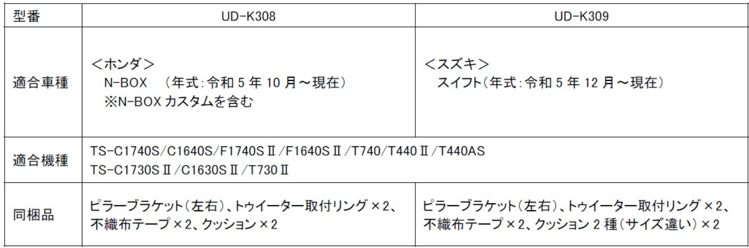 パイオニアは、カロッツェリア トゥイーター取付キット「UD-K308」(ホンダ N-BOX用)と「UD-K309」(スズキ スイフト用)を発売します。