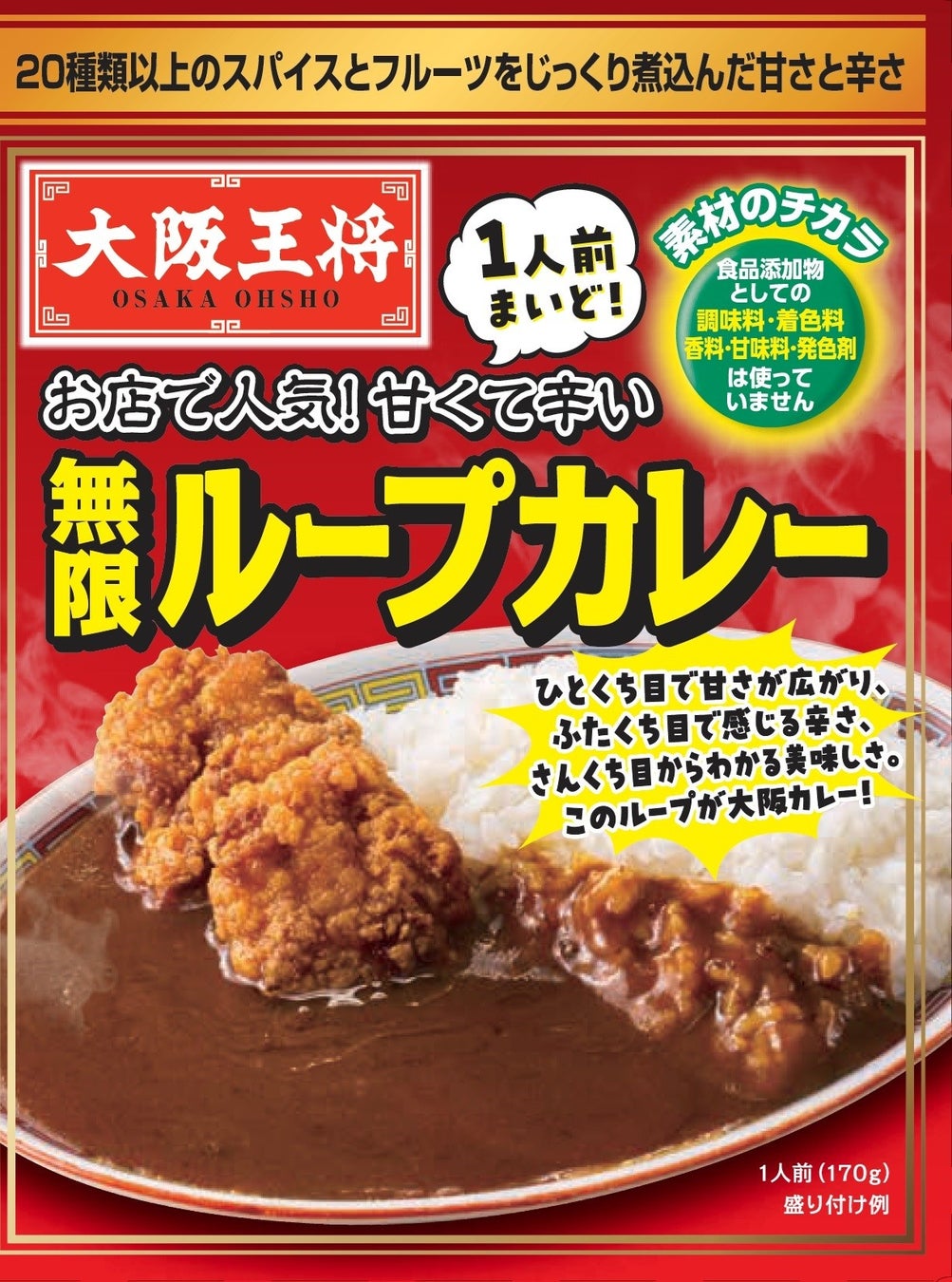 大阪王将では店舗でカレーを販売しています。スパイスの辛さとフルーツの甘さが交差するカレーとして人気のメニューです。この人気のカレーを、ご家庭でも簡単に楽しめる常温商品として開発しました。20種類以上のスパイスを配合したやみつきになる辛さと、バナナやりんごによる深いコクのある甘さが特徴。さらに、牛肉と野菜の旨味が溶け込んだ、複雑でクセになる味わいです。甘さと辛さが交互にやってくる、“無限ループ”カレー。その名の通り、無限に食べたくなるような美味しさをお楽しみいただけます。