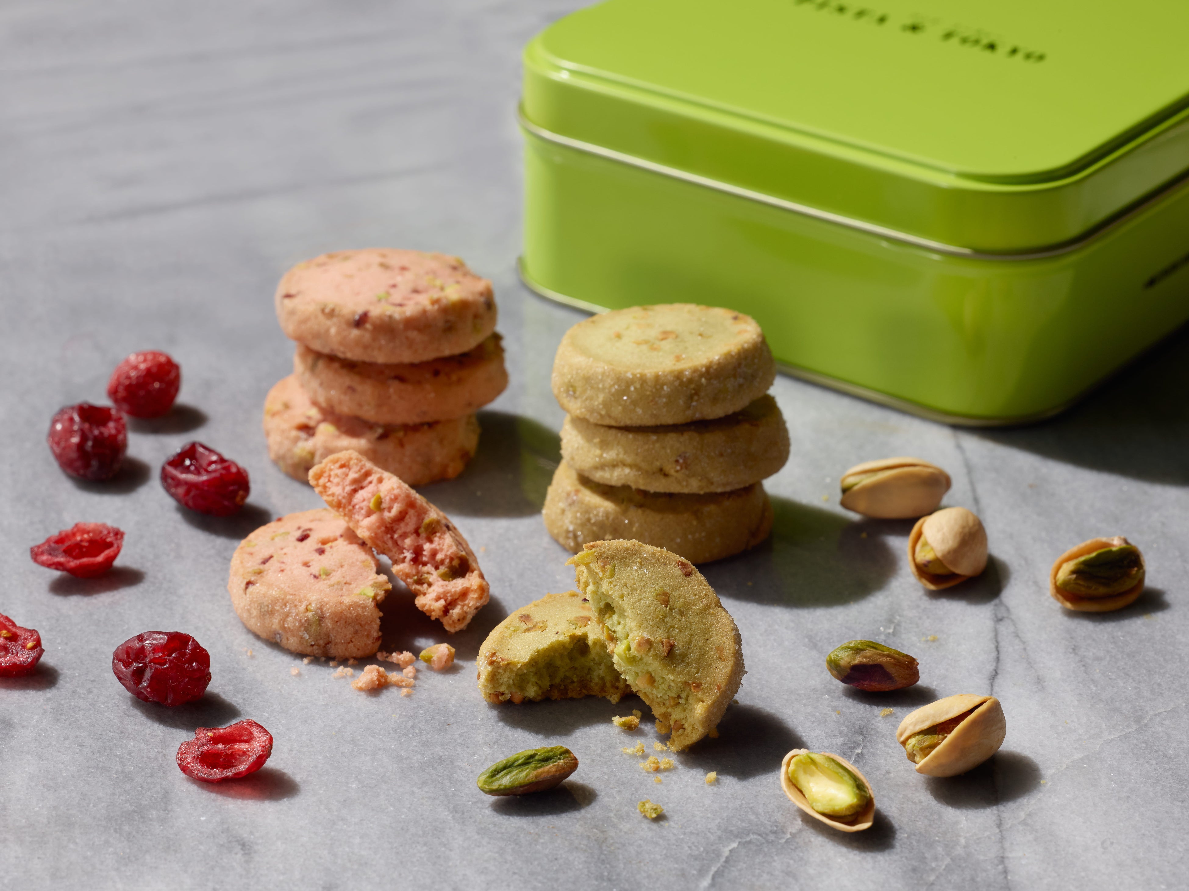 ピスタチオ&クランベリー:ドライクランベリーを練り込んだクッキー生地に刻んだローストピスタチオを加えベリーの風味がピスタチオの香ばしさを引き立てるあじわいへと仕上げました。