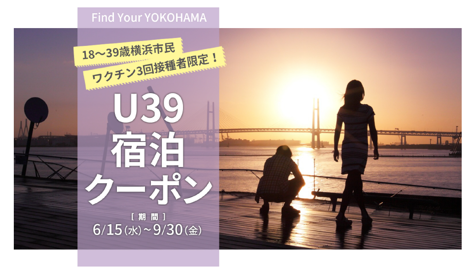 3回目の新型コロナワクチンを接種した20代・30代の横浜市民の方(18歳、19歳を含む)に向けて、対象の市内ホテル等の宿泊時(20,000円以上)に利用できる割引額15,000円の「U39宿泊クーポン」を6/15(水)14時から配布!