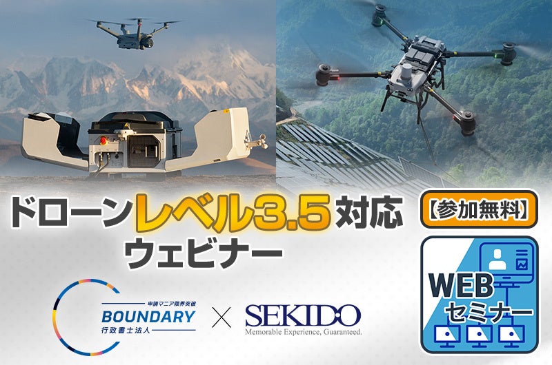DJI(ディージェイアイ)正規販売代理店としてドローンビジネスを支える株式会社セキド(本社:東京都港区、代表取締役:⼤下貴之)は、バウンダリ行政書士法人(本社:東京都千代田区、代表行政書士:佐々木慎太郎)と共同で、ドローンのレベル3.5飛行(補助者なしでの目視外飛行)に関する無料WEBセミナーを2025年5月22日(木)15時より開催いたします。