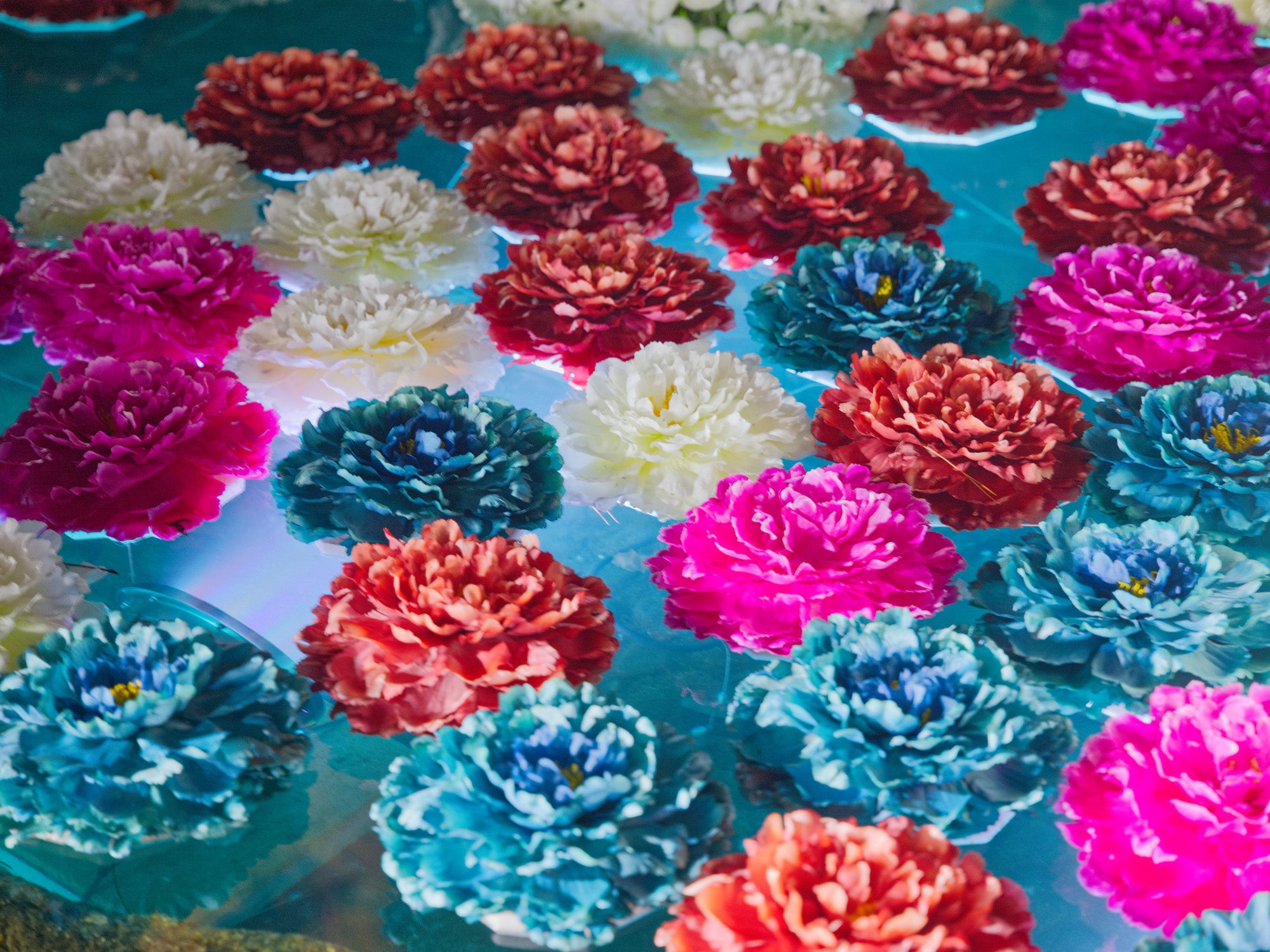 日が落ちると、物語は新たな場面へ変化します。『浮花』 -Fuka- のコンセプトに共鳴したアートイベント「宙-SORA-」の制作チームが、水面に浮かぶ花のオブジェをライトアップで引き立てます。水中から沸き上がる柔らかな光と、池の周囲から降り注ぐ緻密な照明が、幽玄でドラマチックな情景を演出します。昼間の鮮やかな 『浮花』 -Fuka- とは異なる、艶やかな空間をお楽しみください。