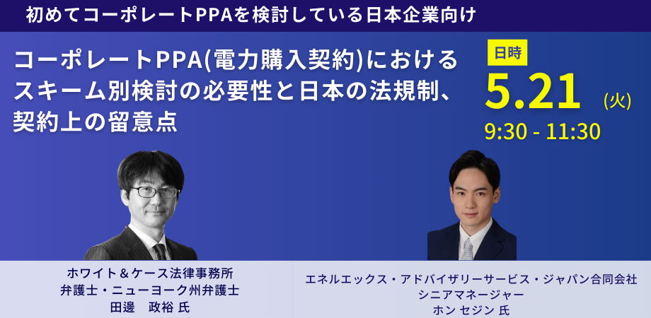 【JPIセミナー】「コーポレートPPA(電力購入契約)におけるスキーム別検討の必要性と日本の法規制、契約上の留意点」5月21日(火)開催