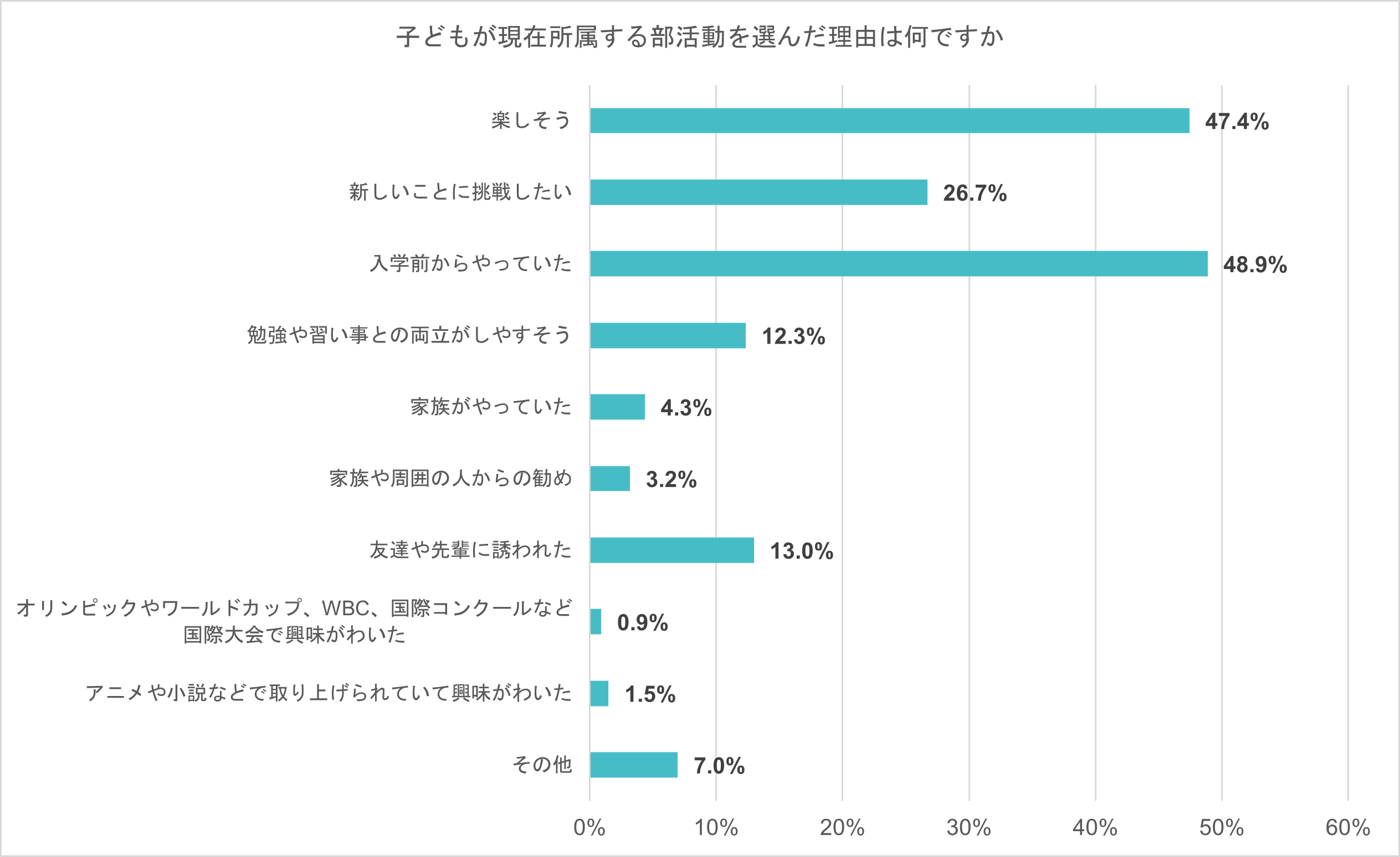 次に、子どもが部活動に所属していると回答した保護者に、子どもがその部活動を選んだ理由を聞いたところ、最も多かったのは「入学前からやっていた」で48.9%だった。は高校入学後も、中学校で所属していた部活動を選ぶことが多いためと考えられる。