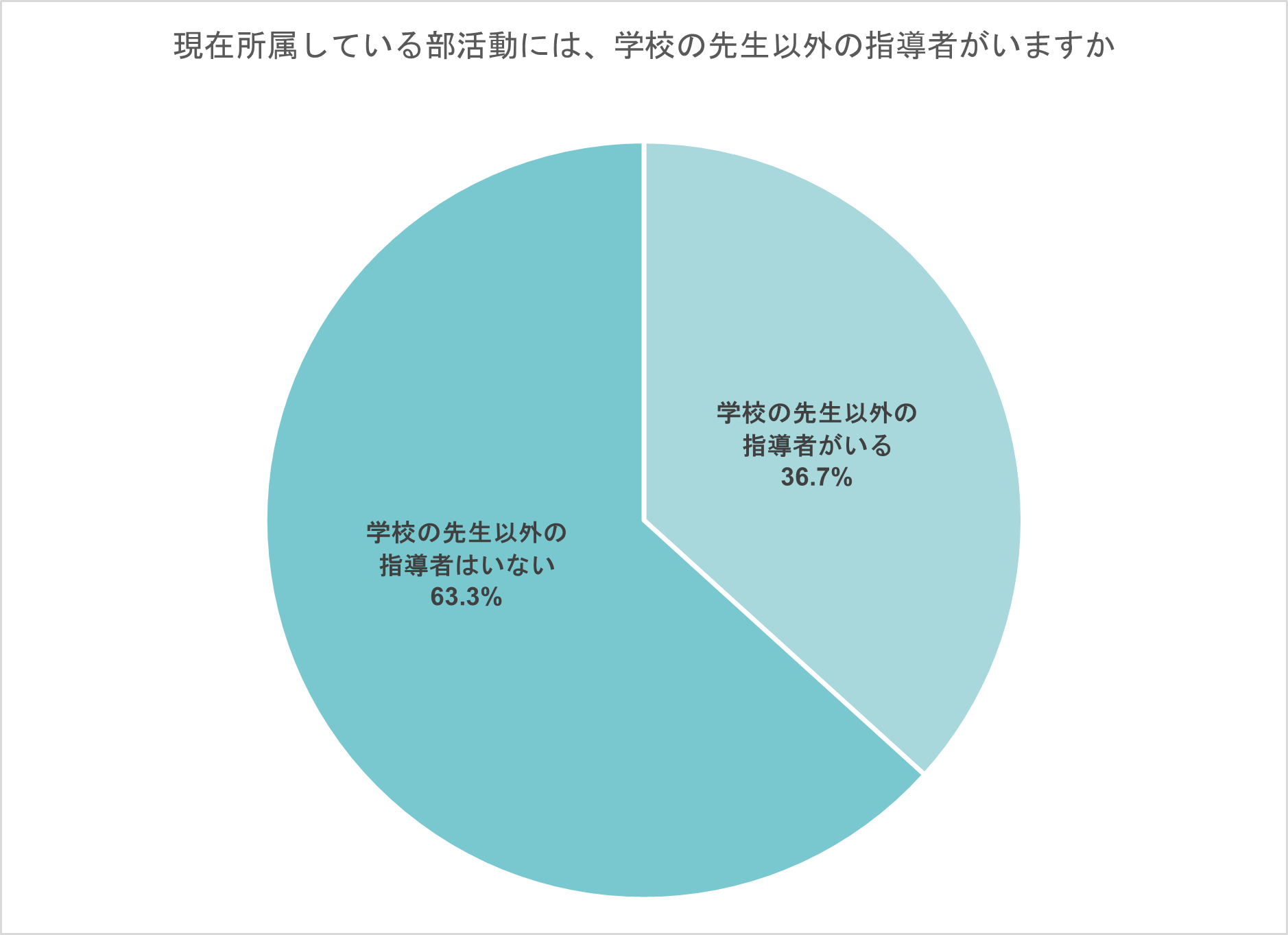 現在子どもが所属している部活動に、学校の先生以外の外部のコーチや部活指導員がいるかを聞いたところ、「学校の先生以外の指導員がいる」は36.7%、「学校の先生以外の指導員はいない」は63.3%だった。