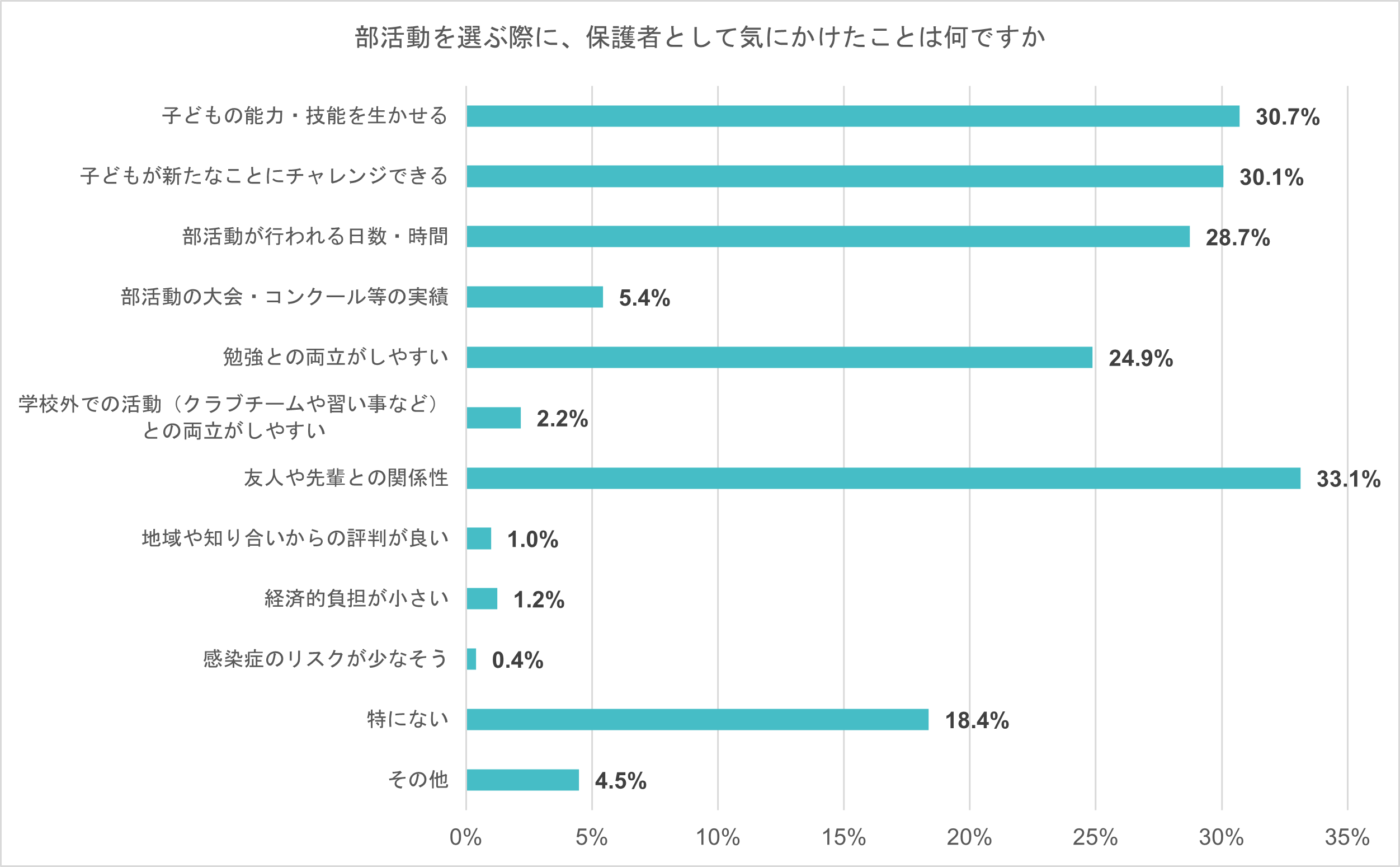子どもが部活動を選ぶ際に、保護者として気にかけたことを聞いた。最も多かったのは「友人や先輩との関係性」で33.1%、次いで「子どもの能力・技術を生かせる」30.7%、「子どもが新たなことにチャレンジできる」30.1%だった。気にかけたことは「特にない」と回答した保護者は18.4%だった。