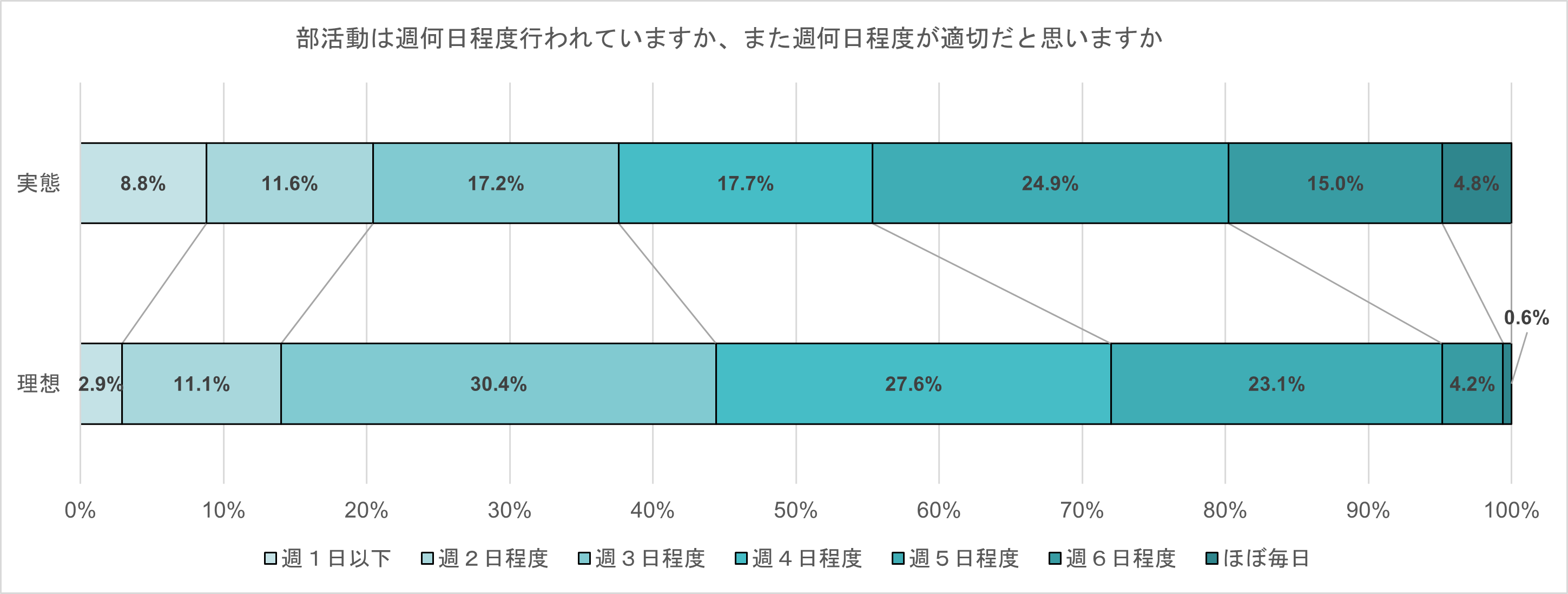 適切だと思う活動日数は、「週3日程度」が30.4%、「週4日程度」が27.6%、は「週5日程度」が23.1%と、実態よりも少ない活動日数が理想だと保護者が考えている傾向にあることが分かった。