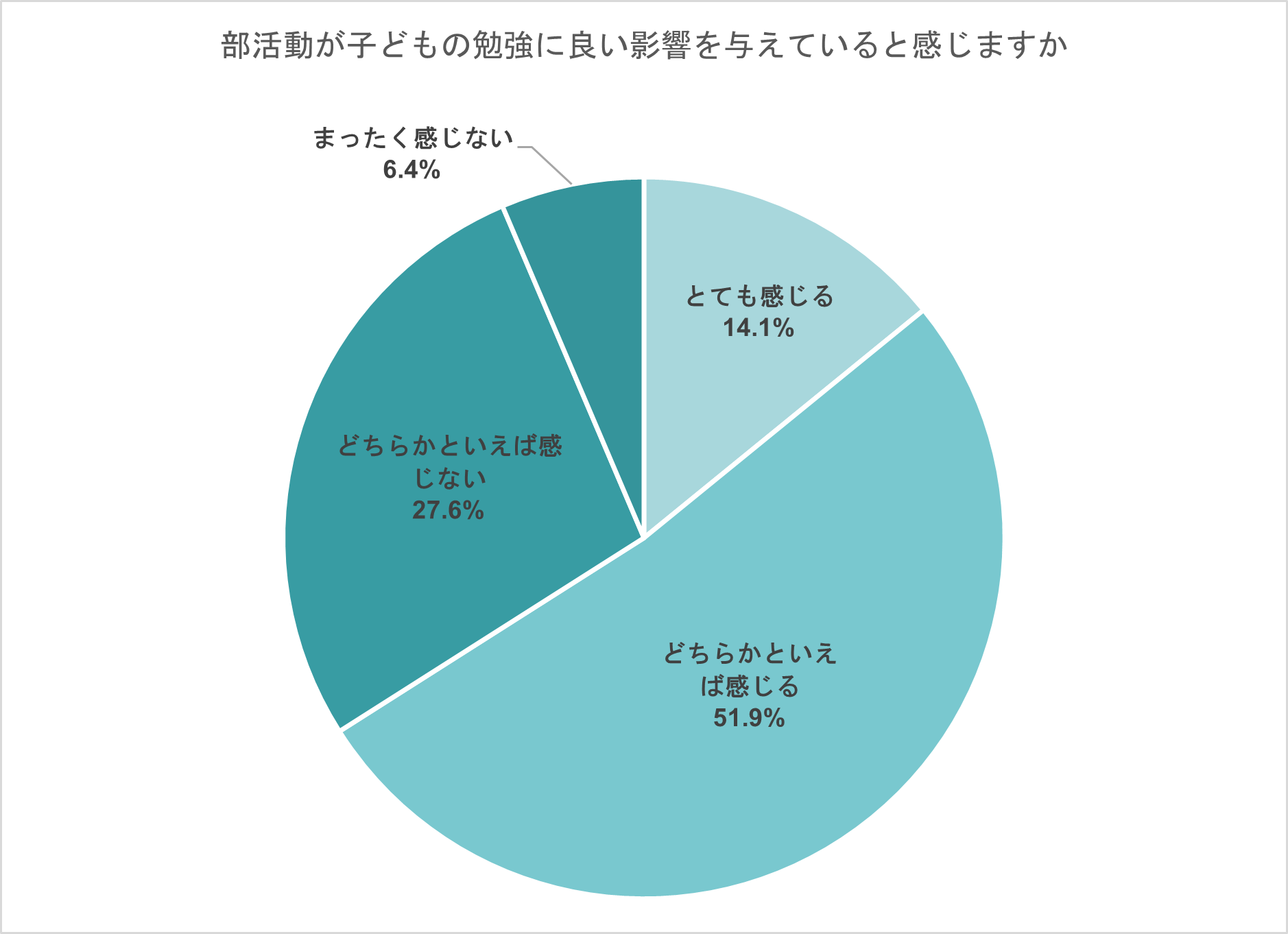 部活動が、勉強に良い影響を与えていると感じるかを聞いたところ、「とても感じる」が14.1%、「どちらかといえば感じる」が51.9%で、保護者の66.0%が、部活動が子どもの勉強にプラスに作用していると感じていることが分かった。