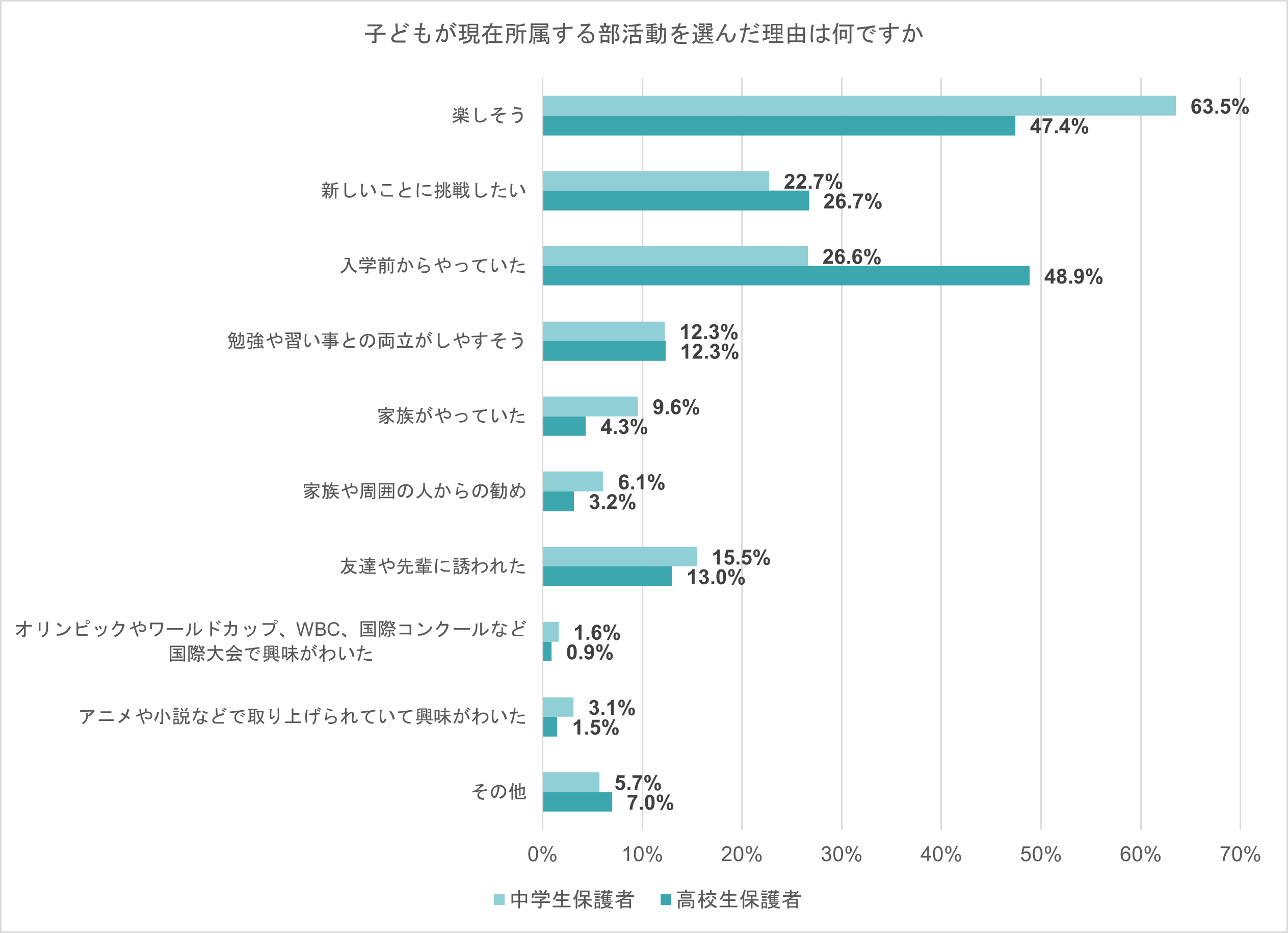 中学生保護者は「楽しそう」、高校生保護者は「入学前からやっていた」が多いことが分かった。高校生は高校入学後も、中学校で所属していた部活動を選ぶことが多いためと考えられる。