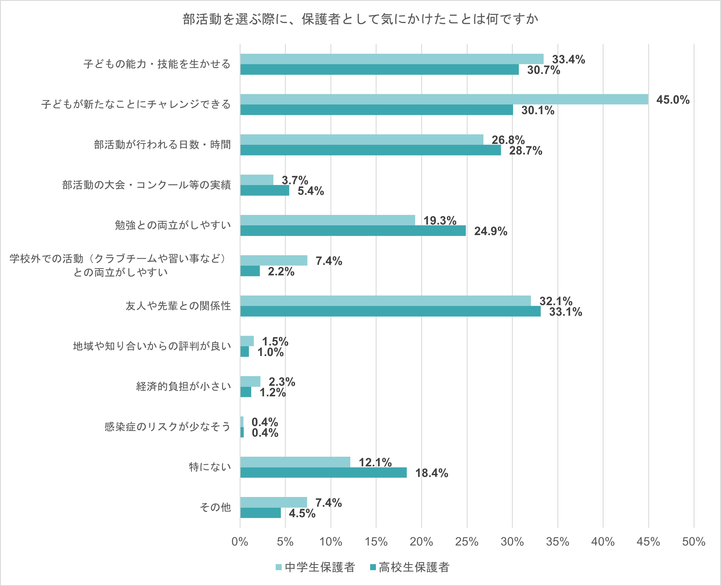 部活動を選ぶ際に保護者として気にかけたこと 「友人・先輩との関係性」「能力・技術を生かせる」「新たなことに挑戦できる」