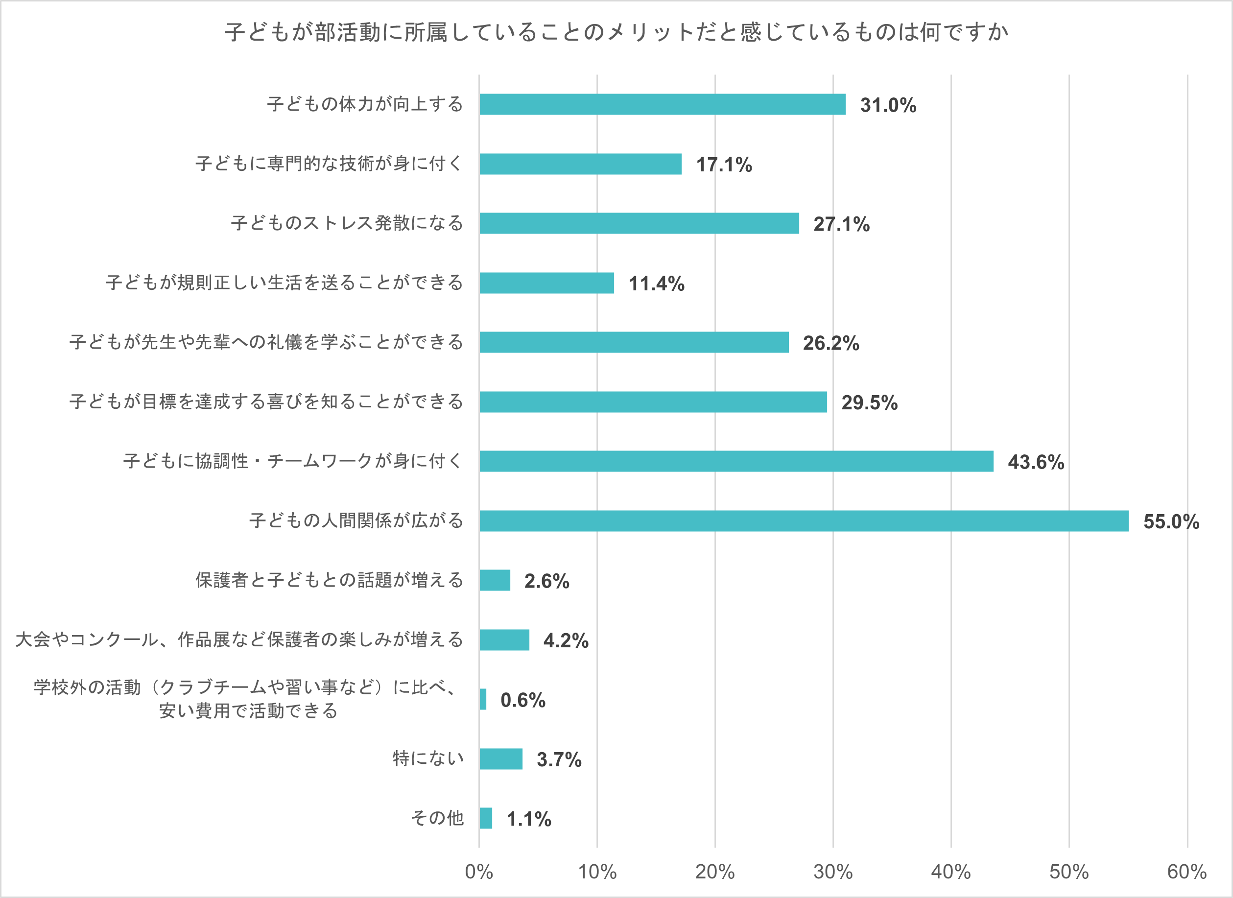 「子どもの人間関係が広がる」が最も多く55.0%、次いで「子どもに協調性・チームワークが身に付く」が43.6%だった。
