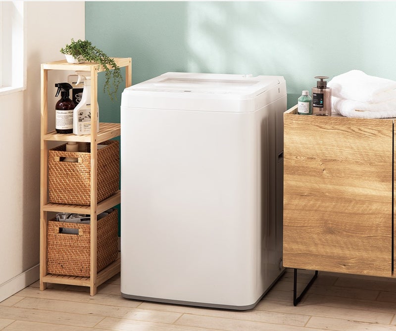 一人暮らしに一般的な4.5kgよりも大容量でまとめ洗いも可能。幅52cmとコンパクト設計なので狭い空間でも設置できます。二つ折り蓋なので洗濯機上部を空けておく必要がなく、スペースを有効的に使えます。