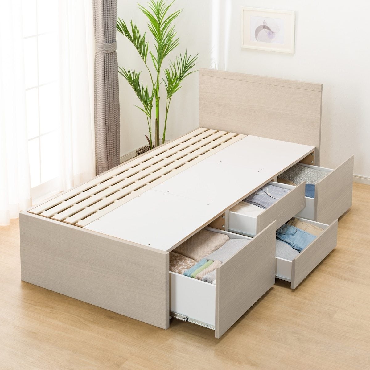 大小4つの引き出しに加えてスノコ床板の下部分にも大容量の収納スペースがあるので、日常使いの物からオフシーズンの物まで場所を分けて効率よく収納できます。