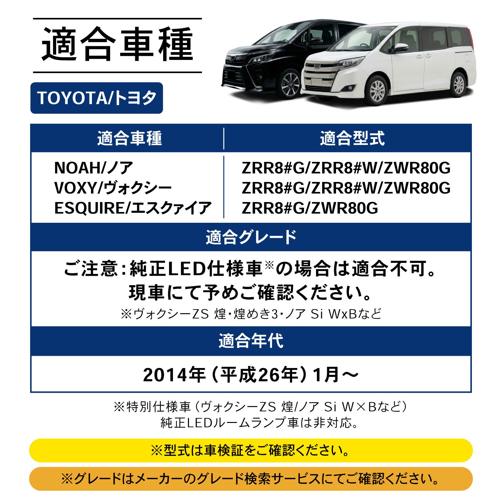 ご注意:純正LED仕様車(ヴォクシーZS 煌・煌めき3・ノア Si W×Bなど)の場合は適合不可。