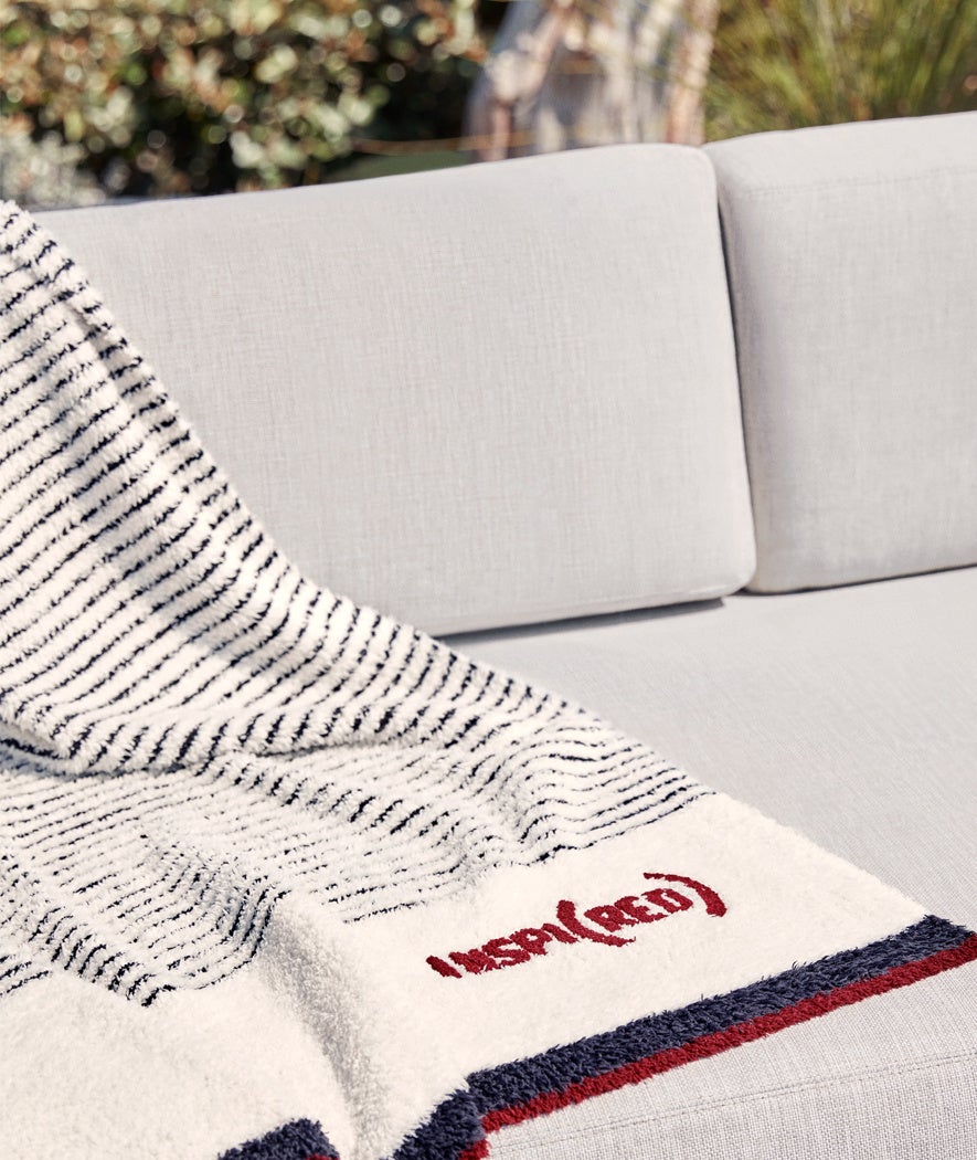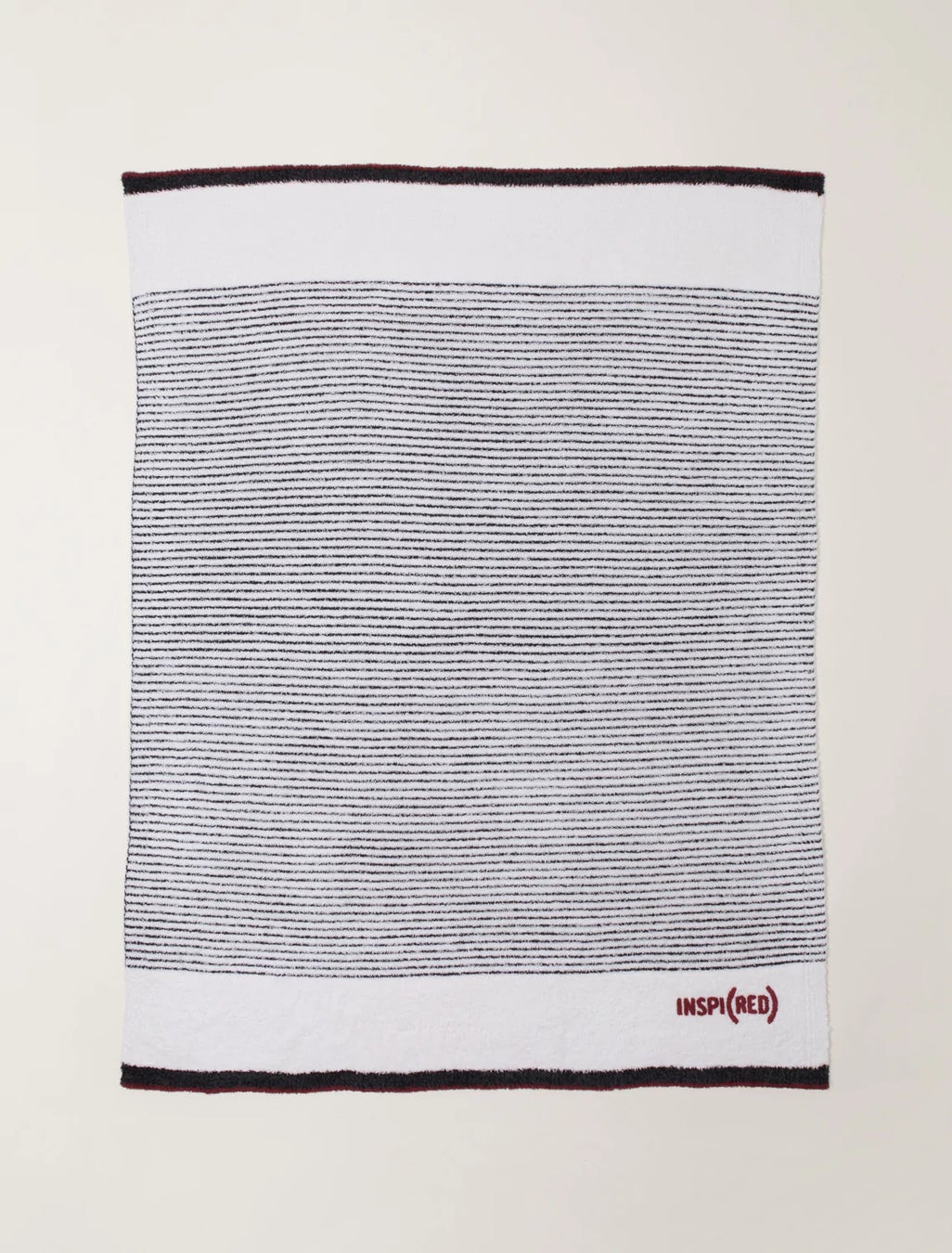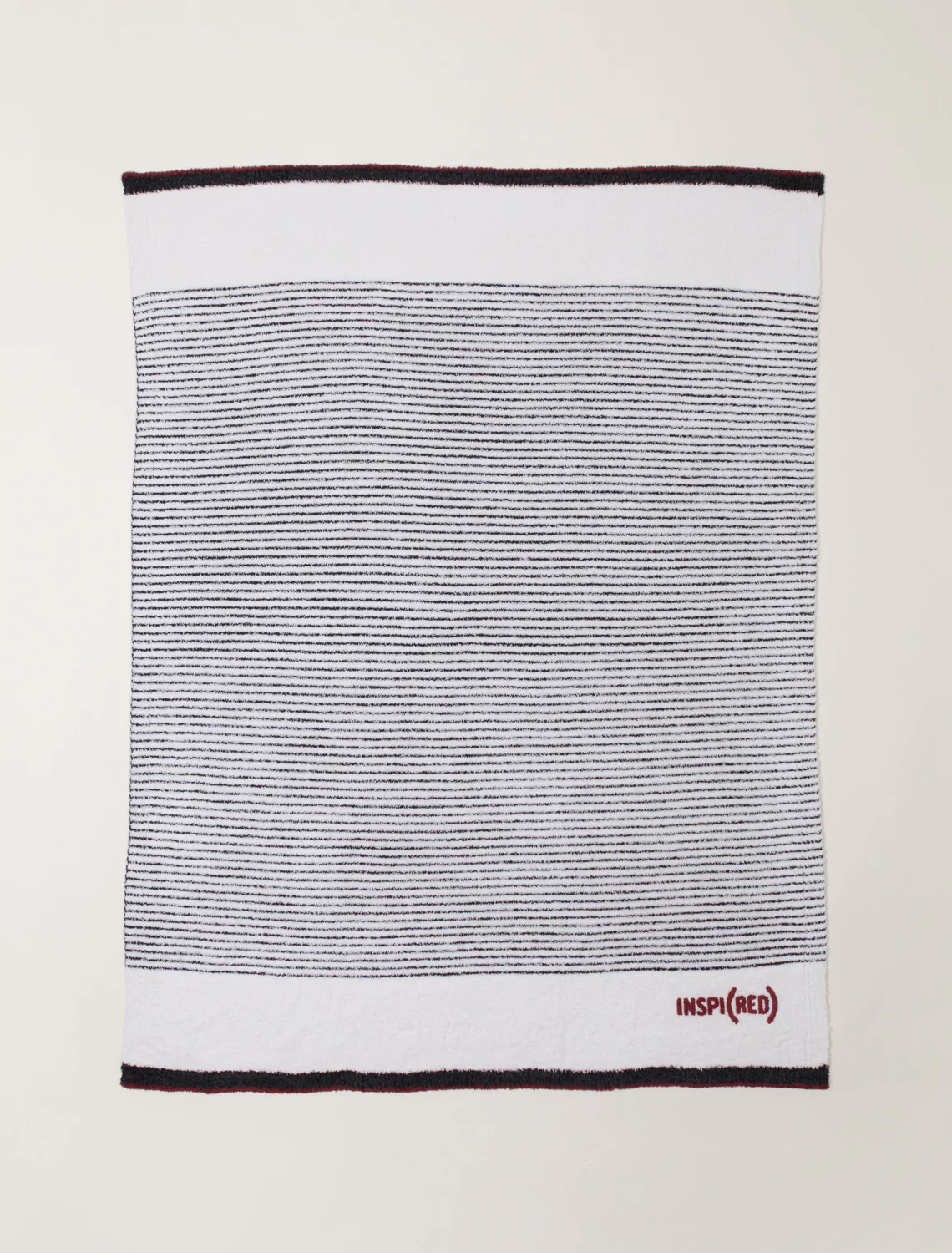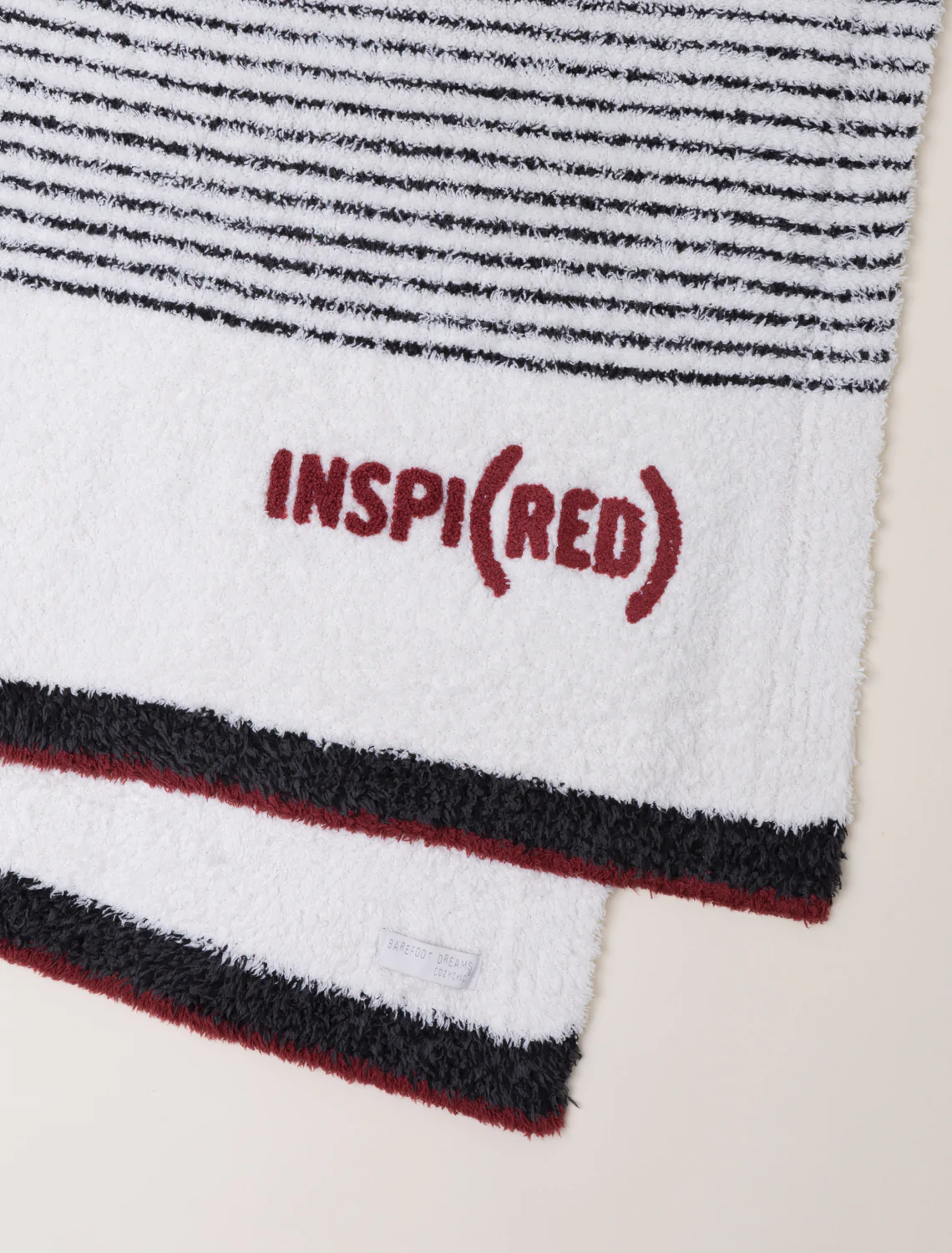このCozyChic®スローは、コントラストが効いたストライプ柄と、(RED)の特徴的な色合いのジャカードニットのロゴINSPI(RED) が特徴です。