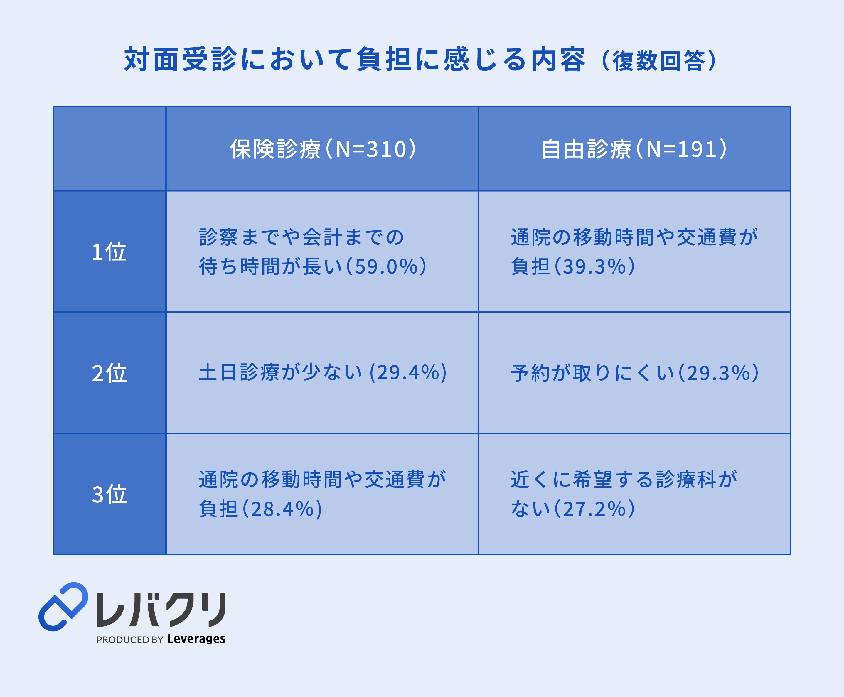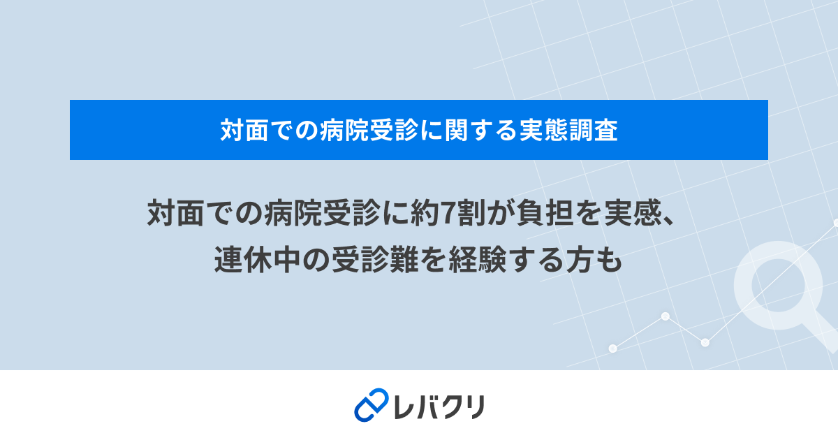 レバレジーズ株式会社が運営するオンライン診療プラットフォーム「レバクリ」(https://levcli.jp/)は、直近1年以内に対面にて病院受診の経験がある520名を対象に、病院受診に関する実態調査を実施しました。