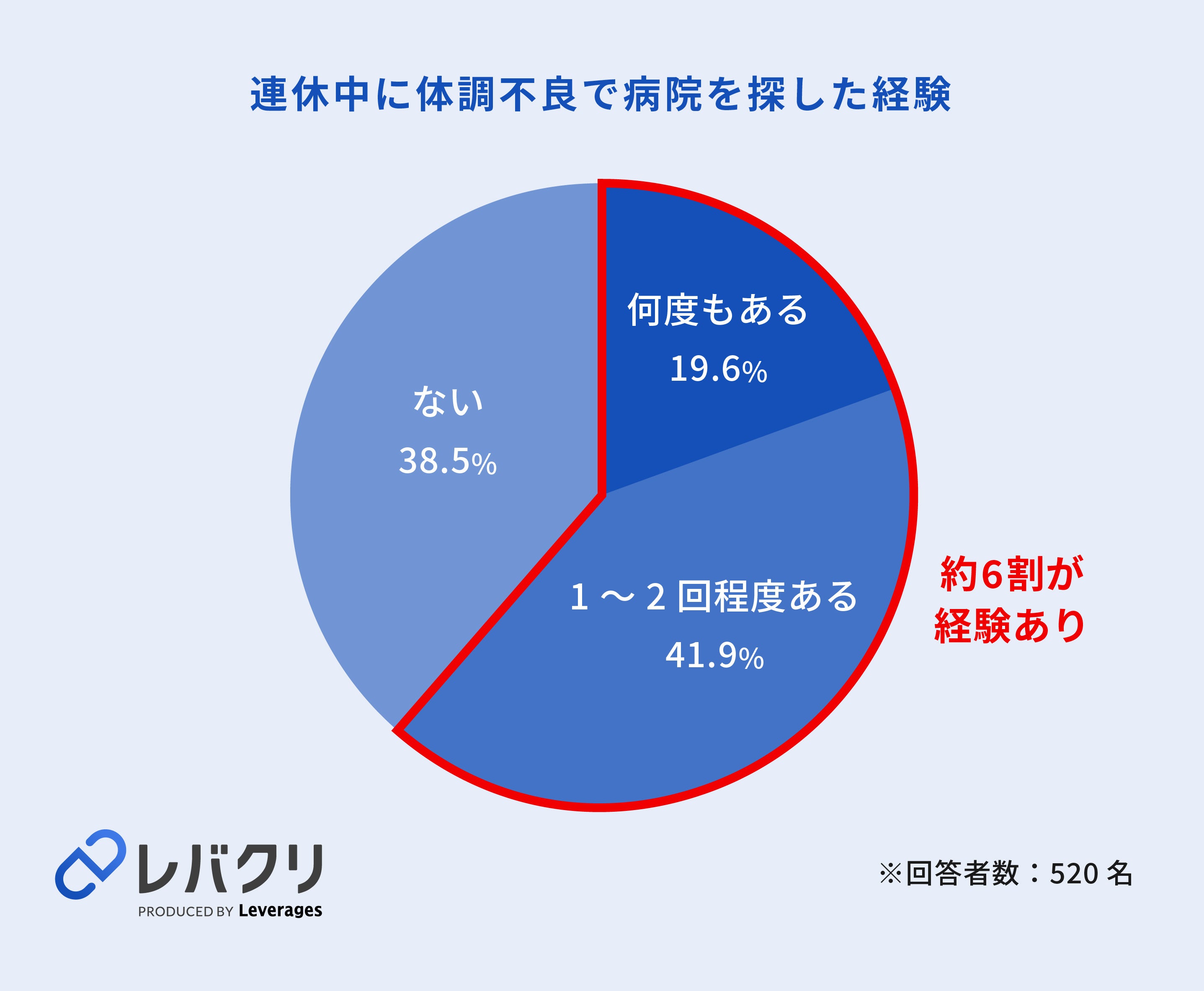 連休中に急な体調不良で病院を探し、受診した経験については、「何度もある(19.6%)」「1~2回程度ある(41.9%)」を合わせて約6割にのぼりました。