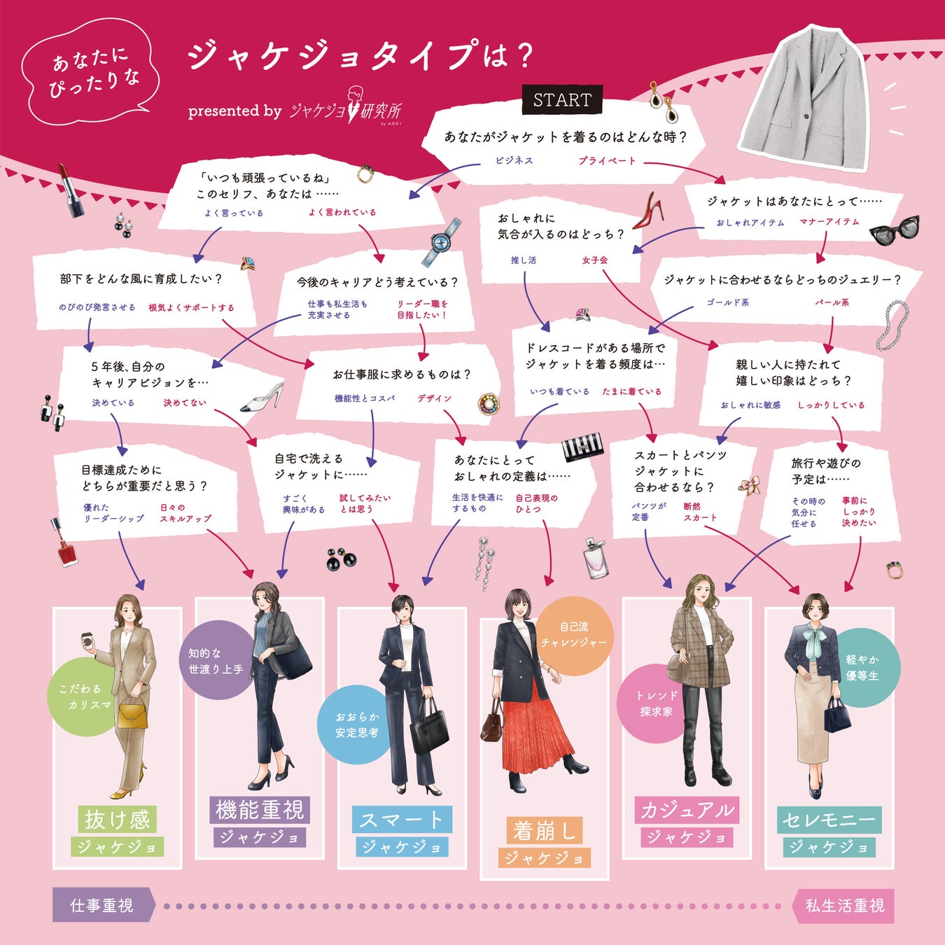 また、女性のジャケット着用における悩みの種を可視化し、「自分らしく着こなせない」「似合うコーディネートが分からない」といったお声の多さをもとに、最適なジャケットを選択するためにAOKIが開発した「ジャケジョクラスタ」「ジャケジョクラスタ診断」を活用することで、自分らしいジャケットを見つけていく方法をご提案します。