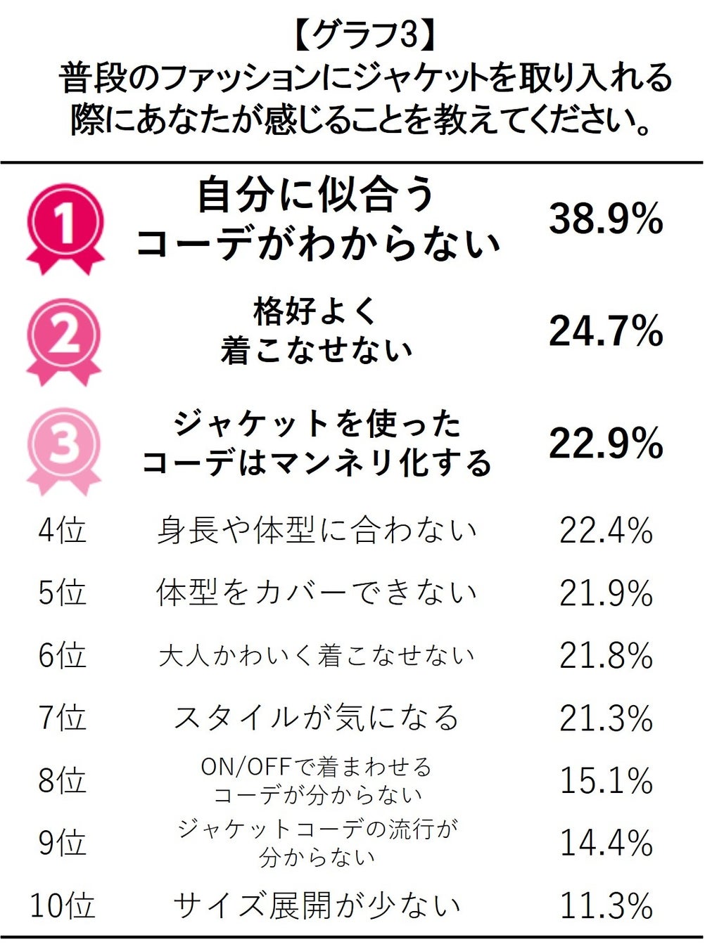 普段のファッションにジャケットを取り入れる際、感じていることについて最も多かった項目は「自分に似合うコーデがわからない」、第2位は「格好よく着こなせない」、第3位は「ジャケットを使ったコーデはマンネリ化する」でした(グラフ3)。