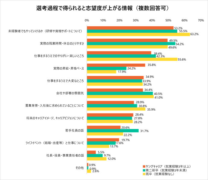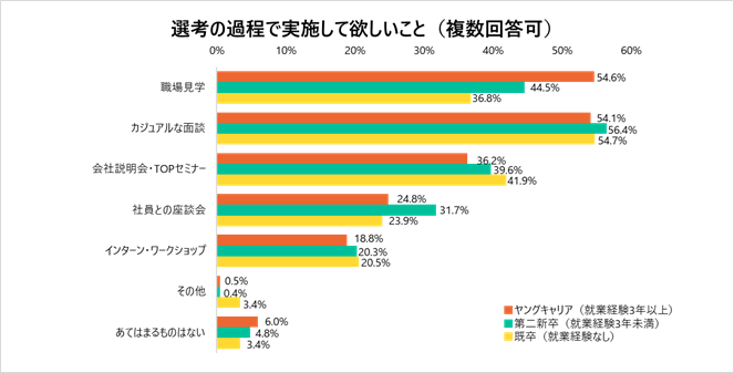 選考過程で実施して欲しいこと1位は、ヤングキャリアが「職場見学」、既卒・第二新卒が「カジュアルな面談」。最も知りたいことは「未経験でもやっていけるか」/20代アンケート