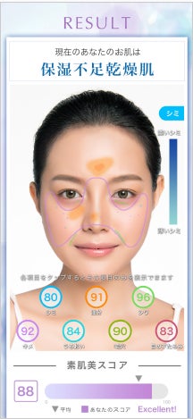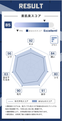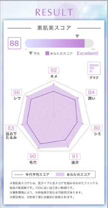 ・7つの肌タイプ(男性版は6つ)と7項目の肌状態の測定結果から、当社独自の肌指数「素肌美スコア」を算出します。結果は3カ月間保存できて、肌の変化を確認することが可能です。